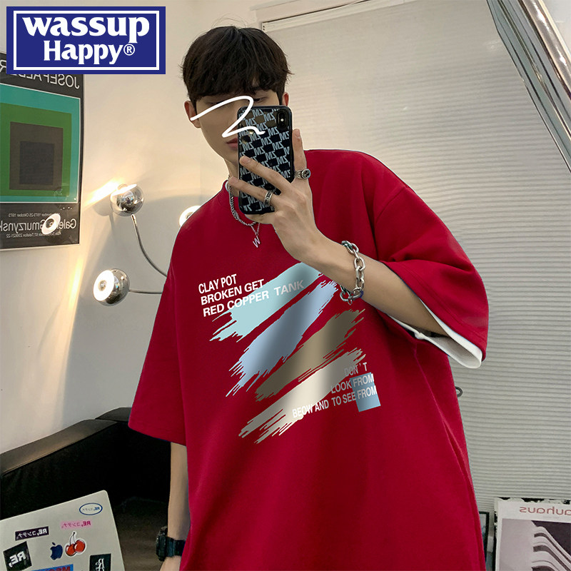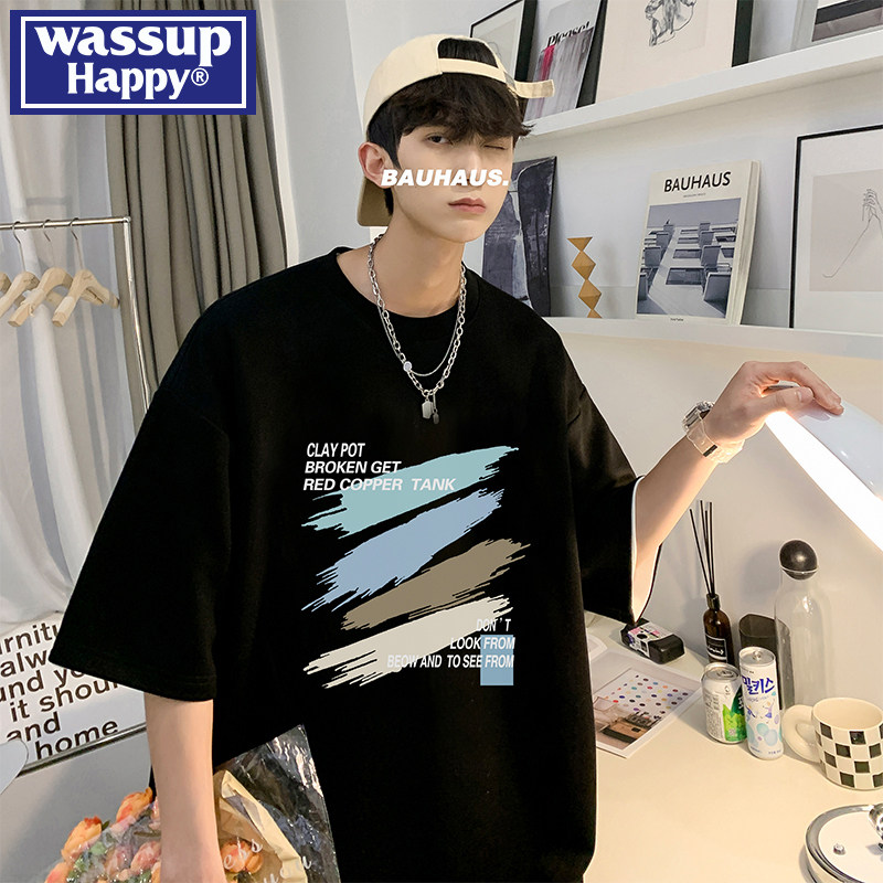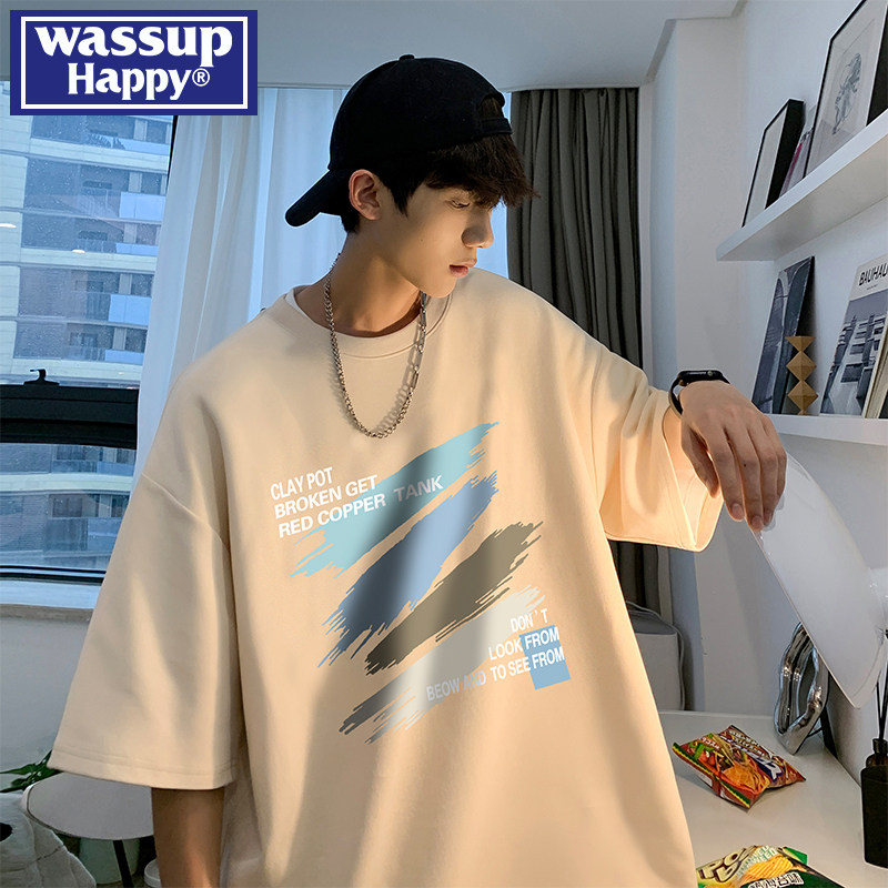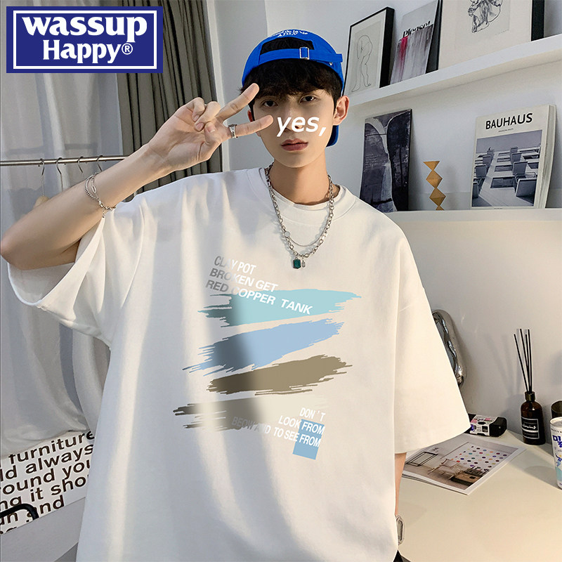 wassup happy圆领短袖t恤男款夏季青少年潮牌百搭宽松半袖上衣服