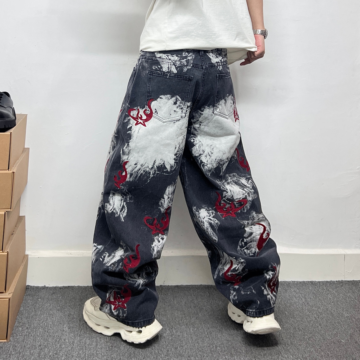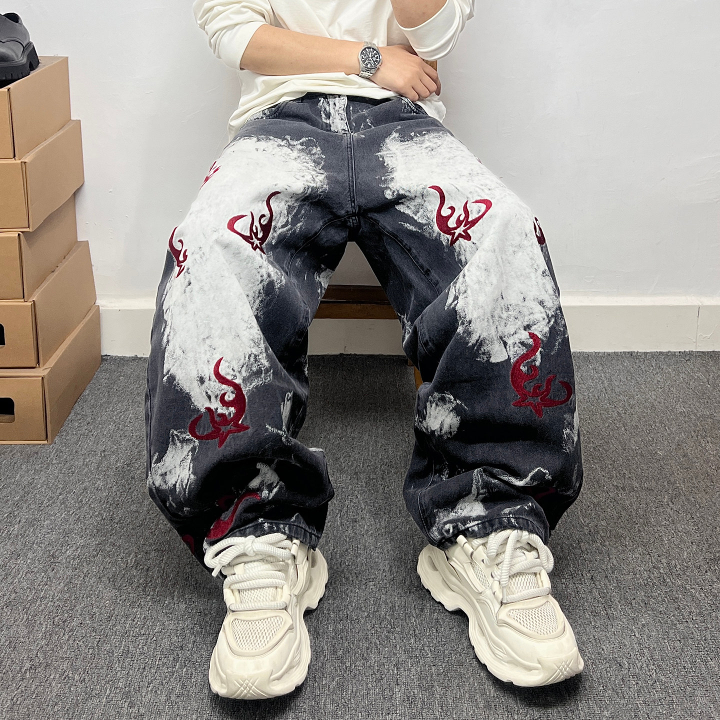 美式复古国潮图腾刺绣弯刀牛仔裤男是大码宽松做旧潮牌直筒长裤子