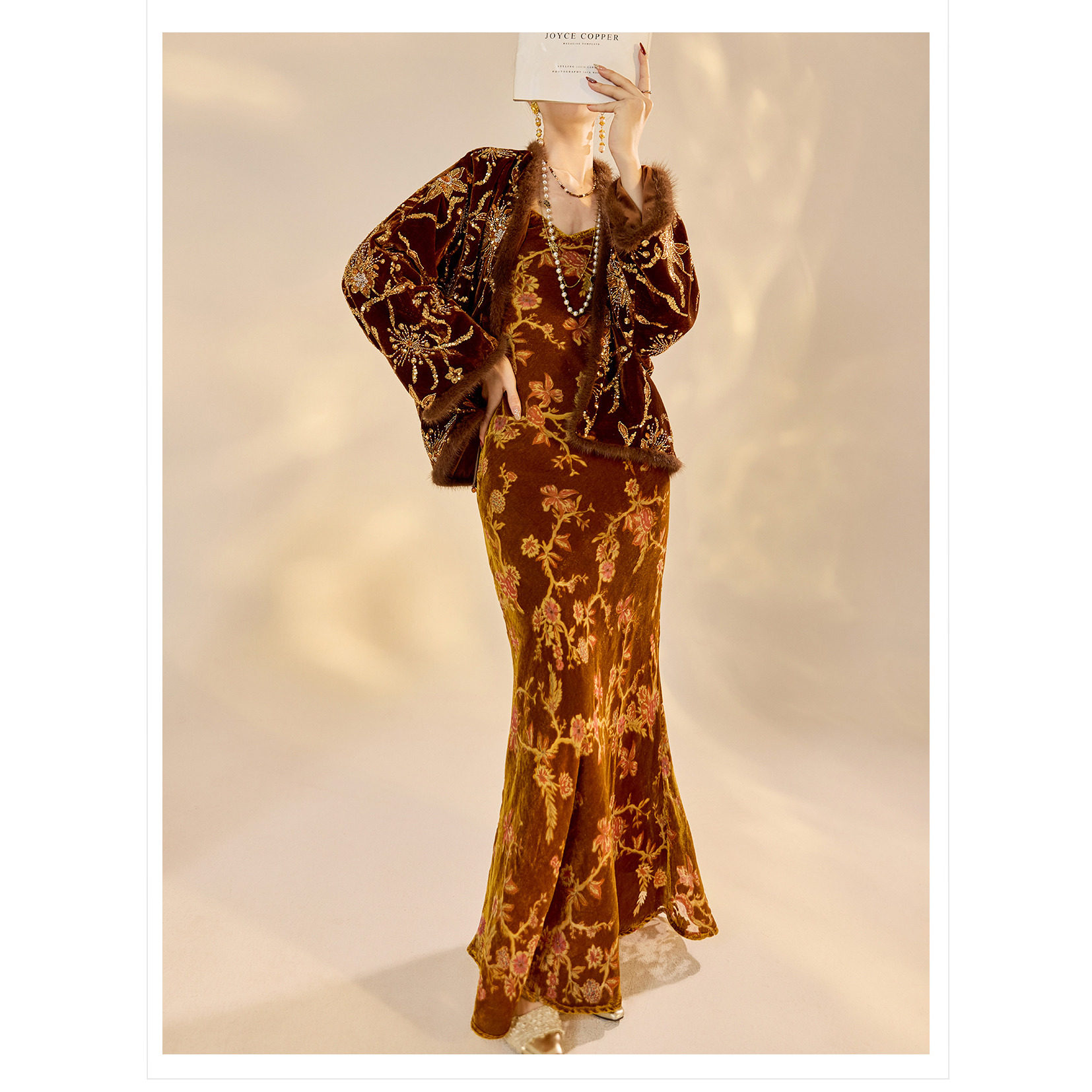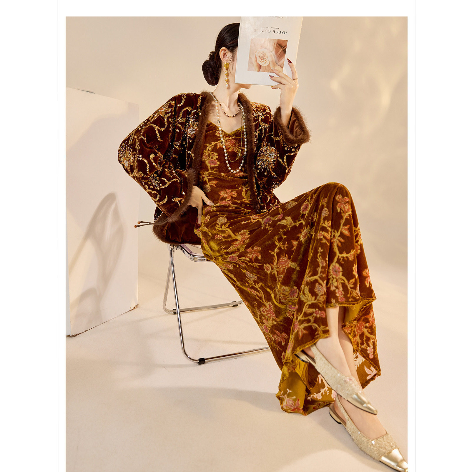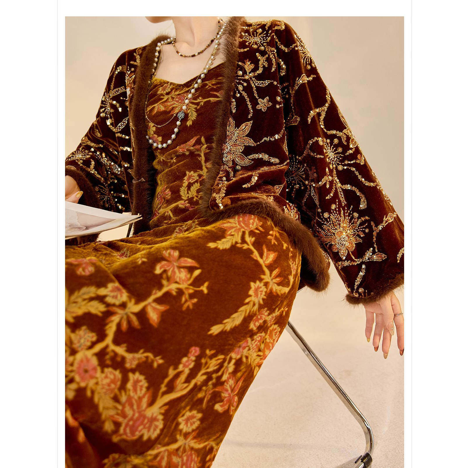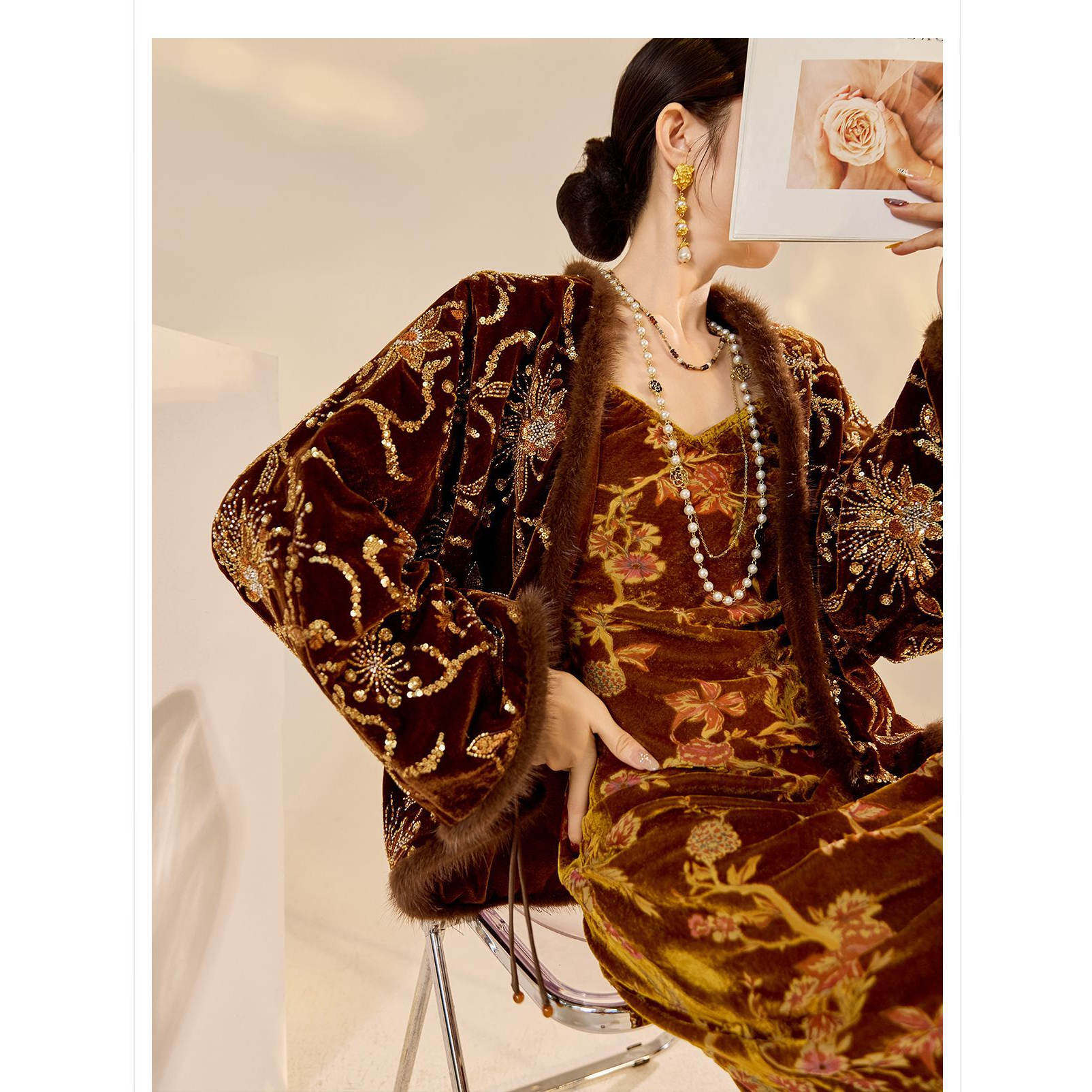 新中式国风复古气质水貂毛加绒刺绣钉珠外套V领提花吊带裙套装女