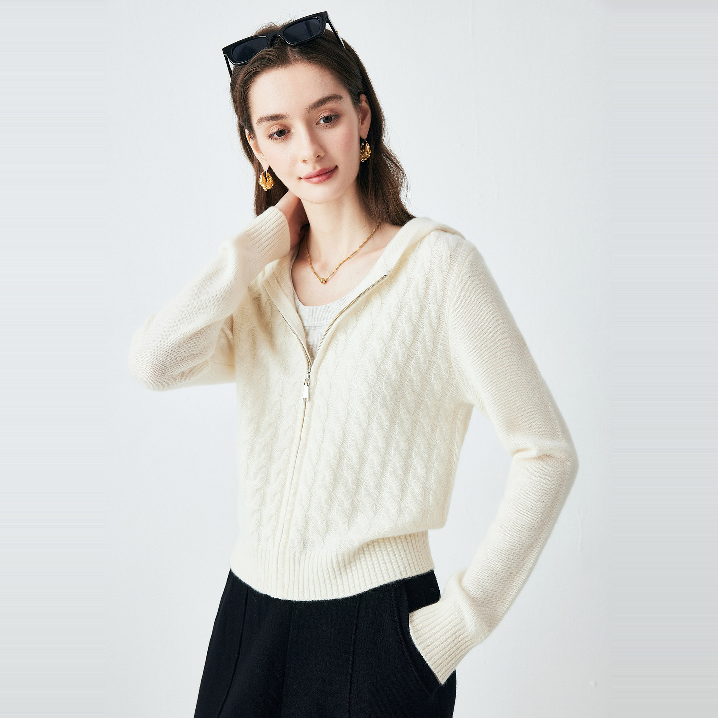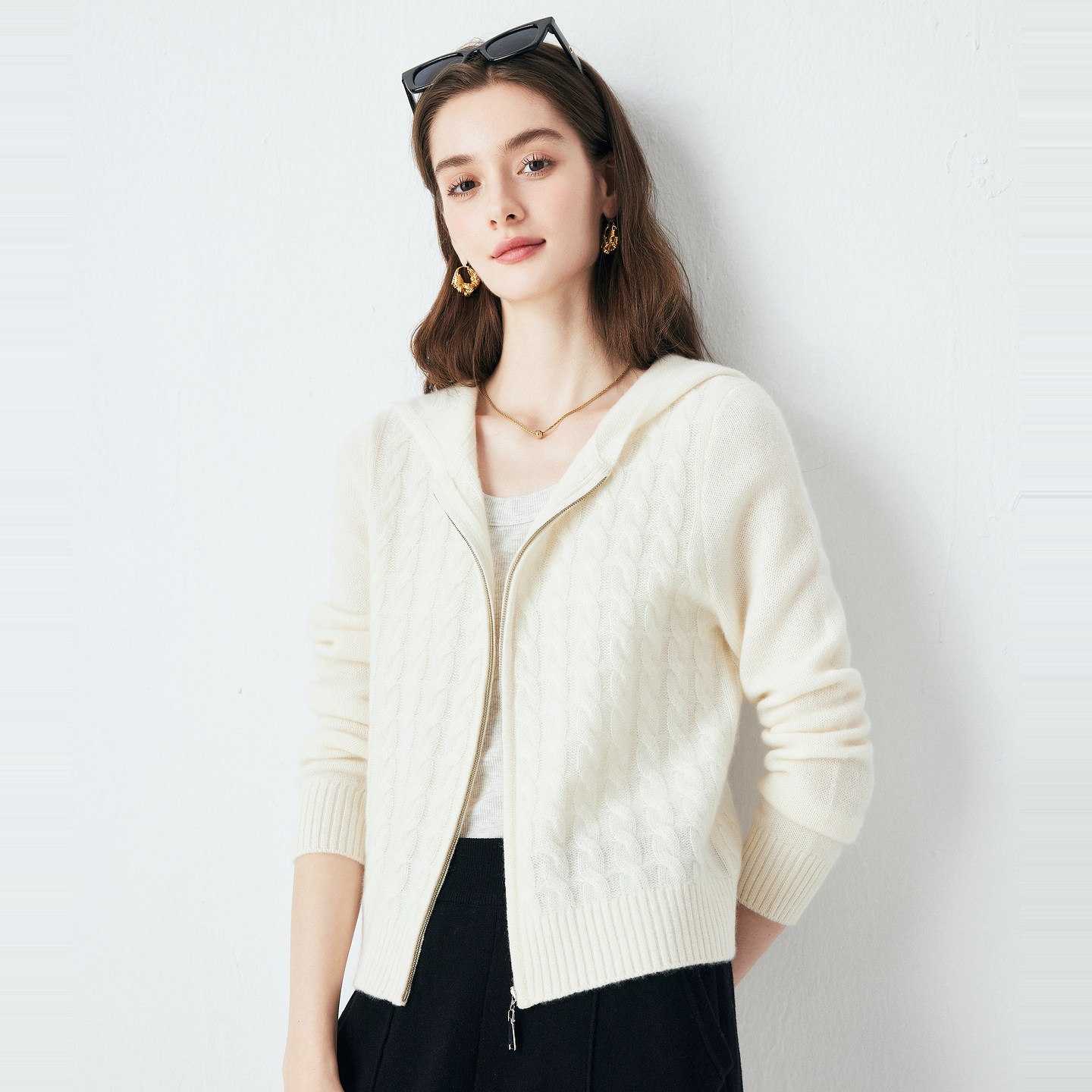 帕罗加厚纯山羊绒秋冬连帽领绞花休闲开衫羊绒衫女外搭针织毛衣