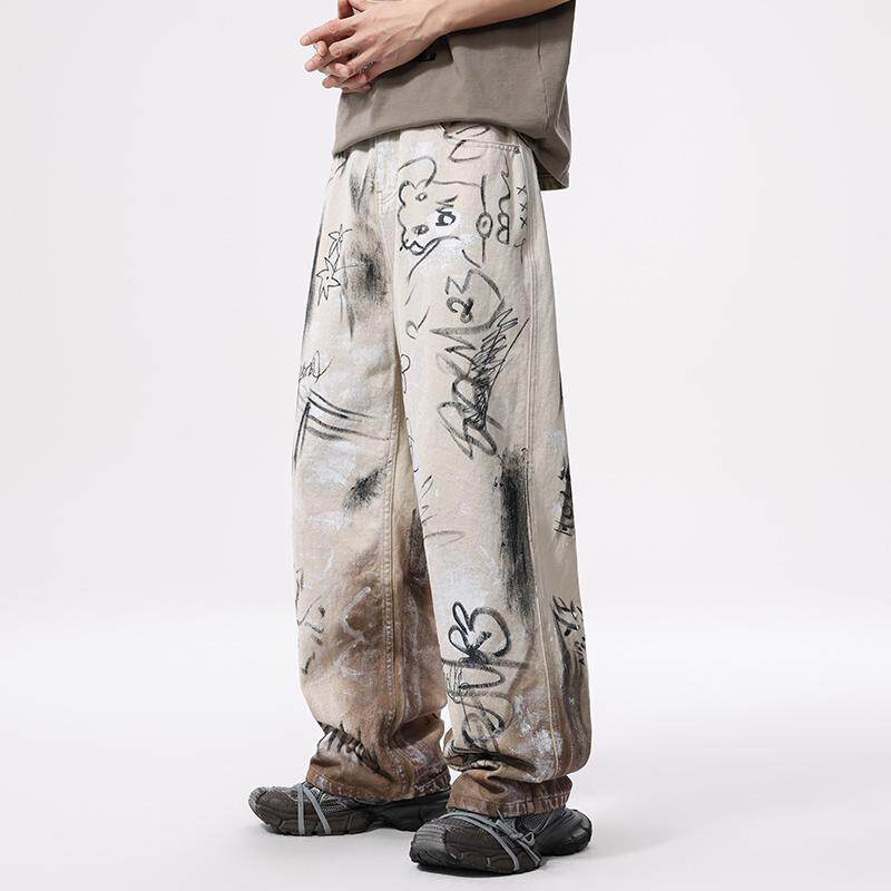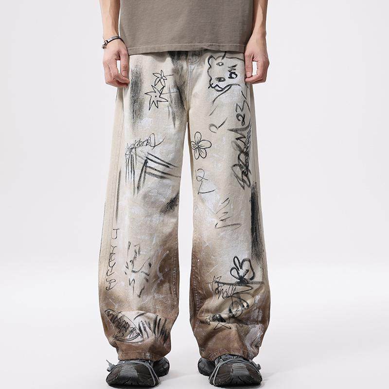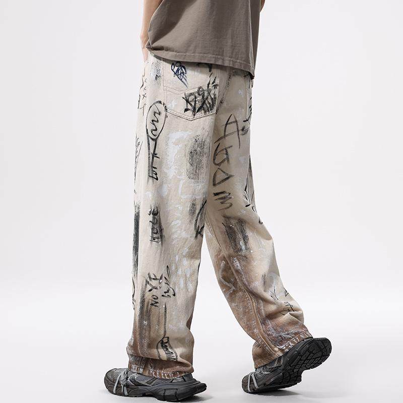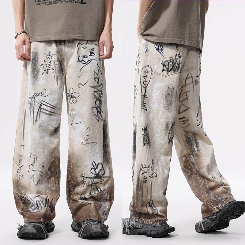 美式高街痞帅vibe风涂鸦做旧牛仔裤男潮流复古宽松直筒百搭阔腿裤