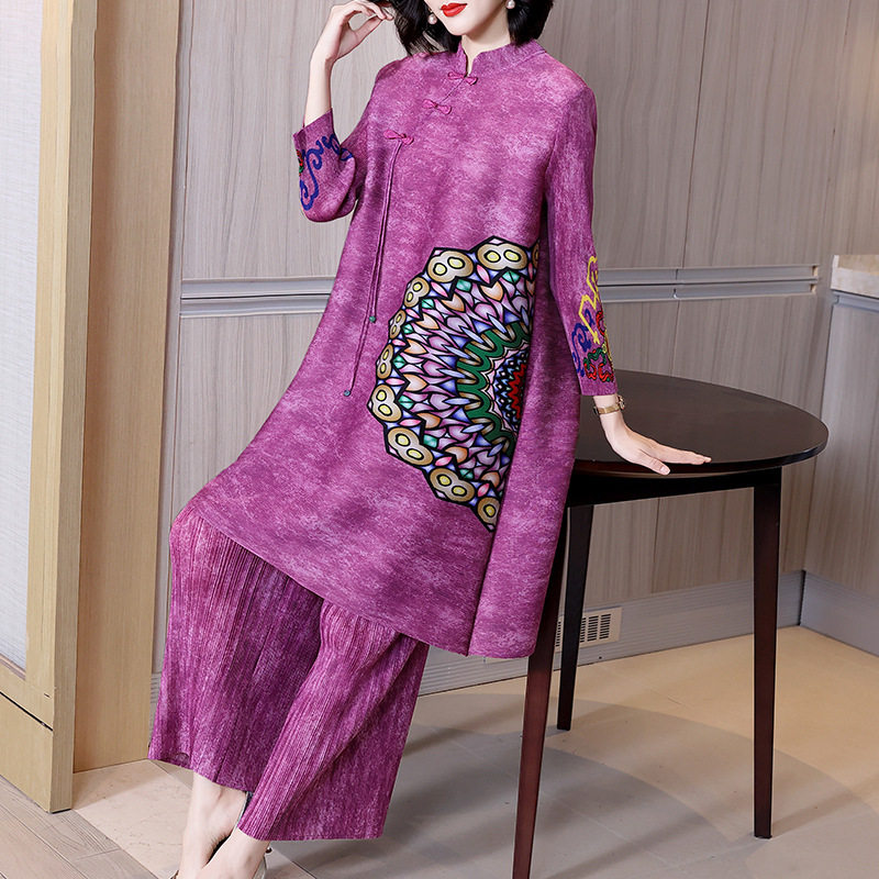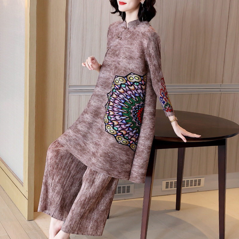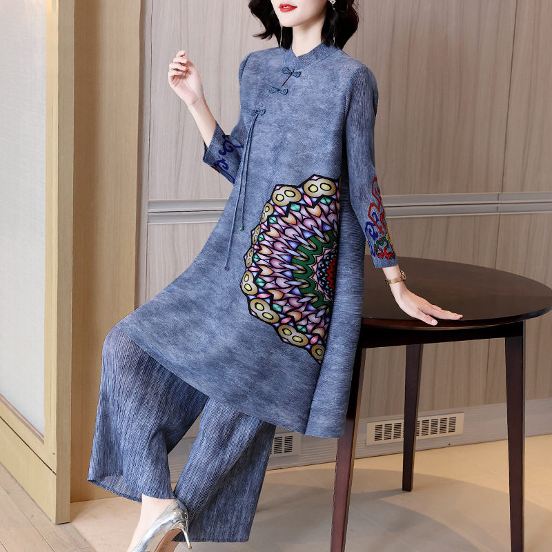 淘宝50-59岁妈妈春装新中式时尚套装国风印花改良旗袍显瘦大码两件套