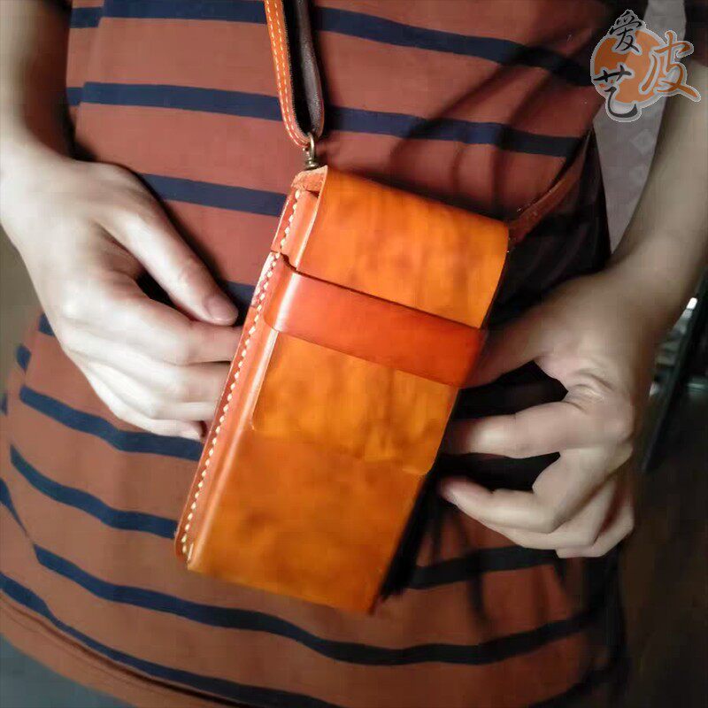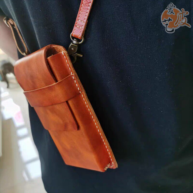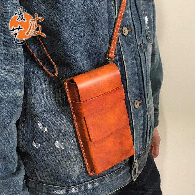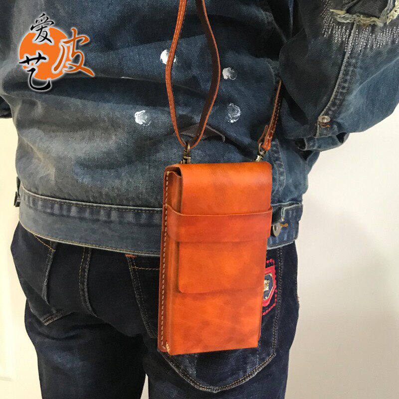淘宝手机小腰包!穿皮带有型单肩斜挎包厚牛皮粗线手缝真皮多功能男女