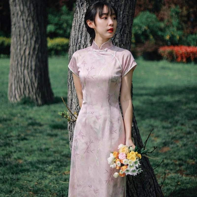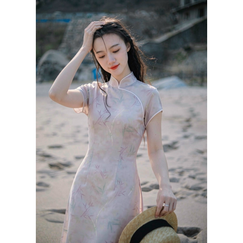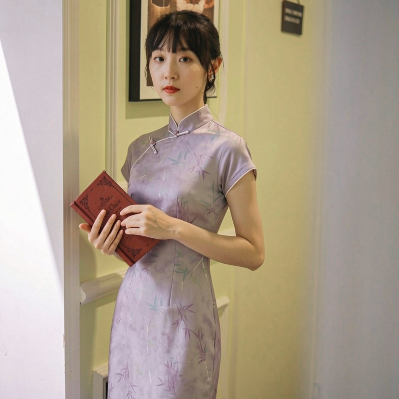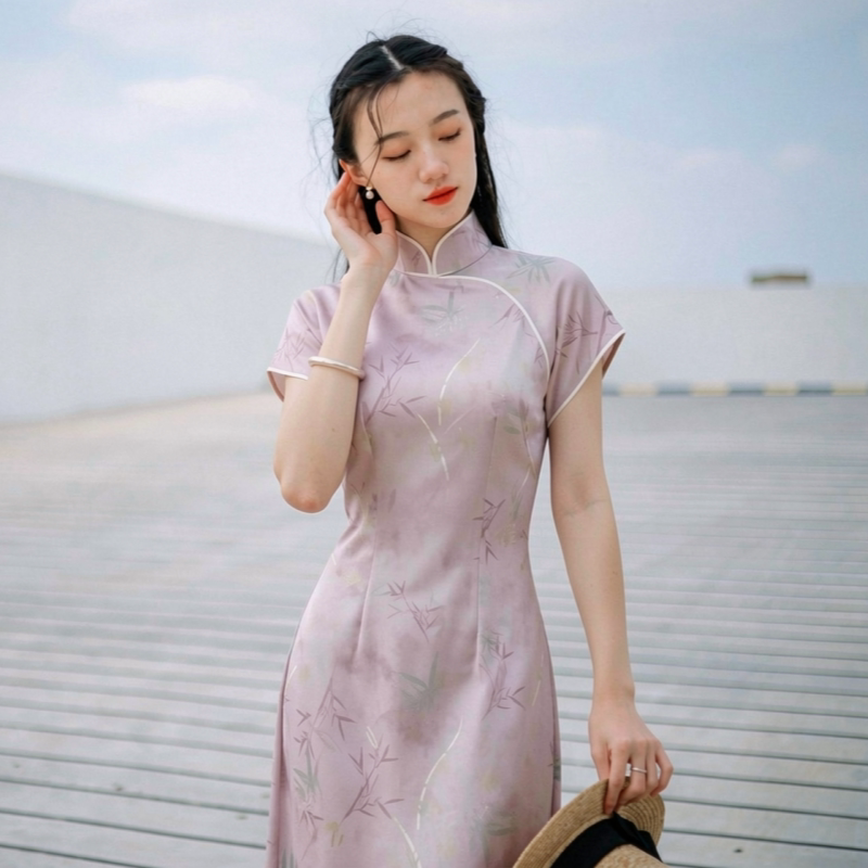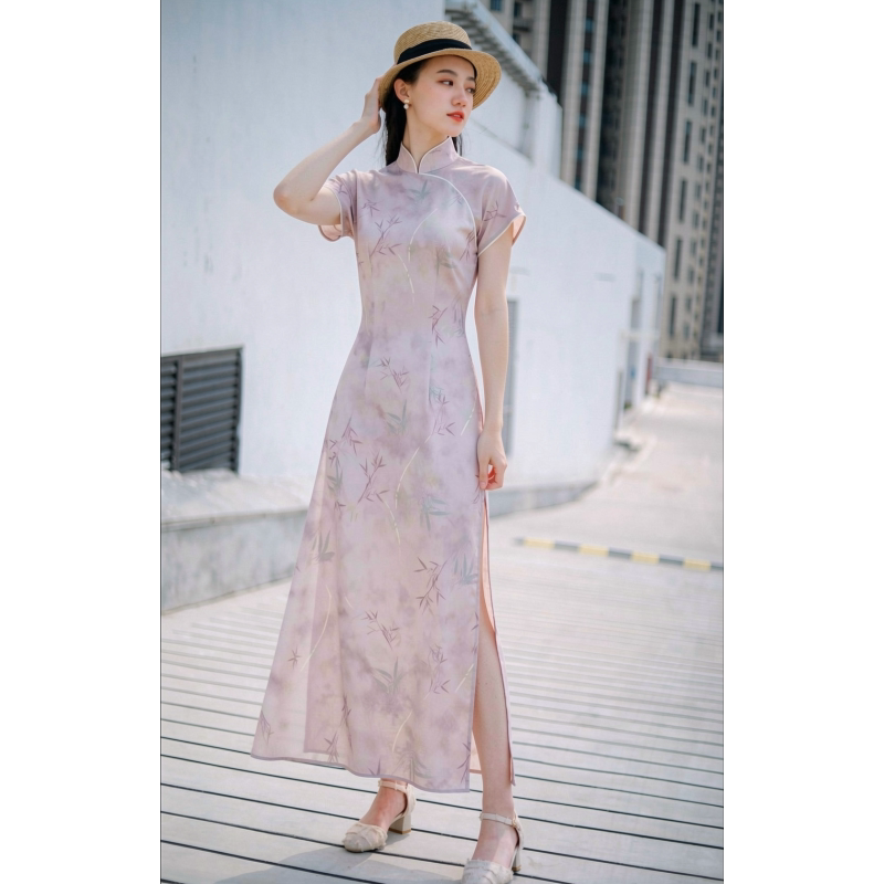 淘宝微笑向暖 新中式淡紫色改良旗袍连衣裙显瘦温柔气质素雅日常可穿