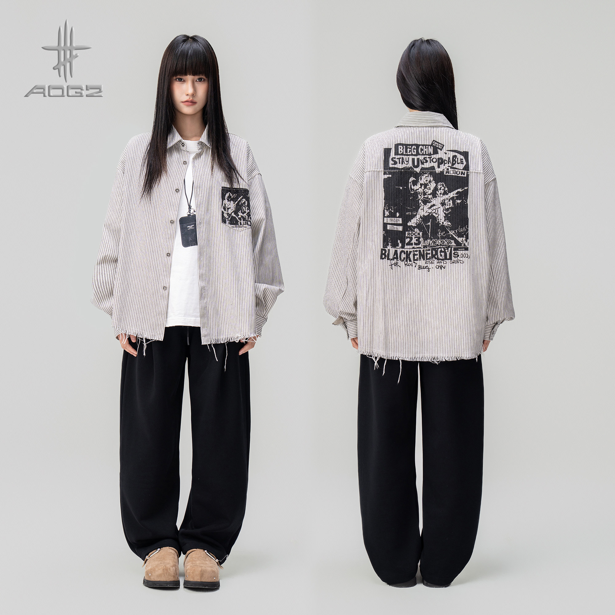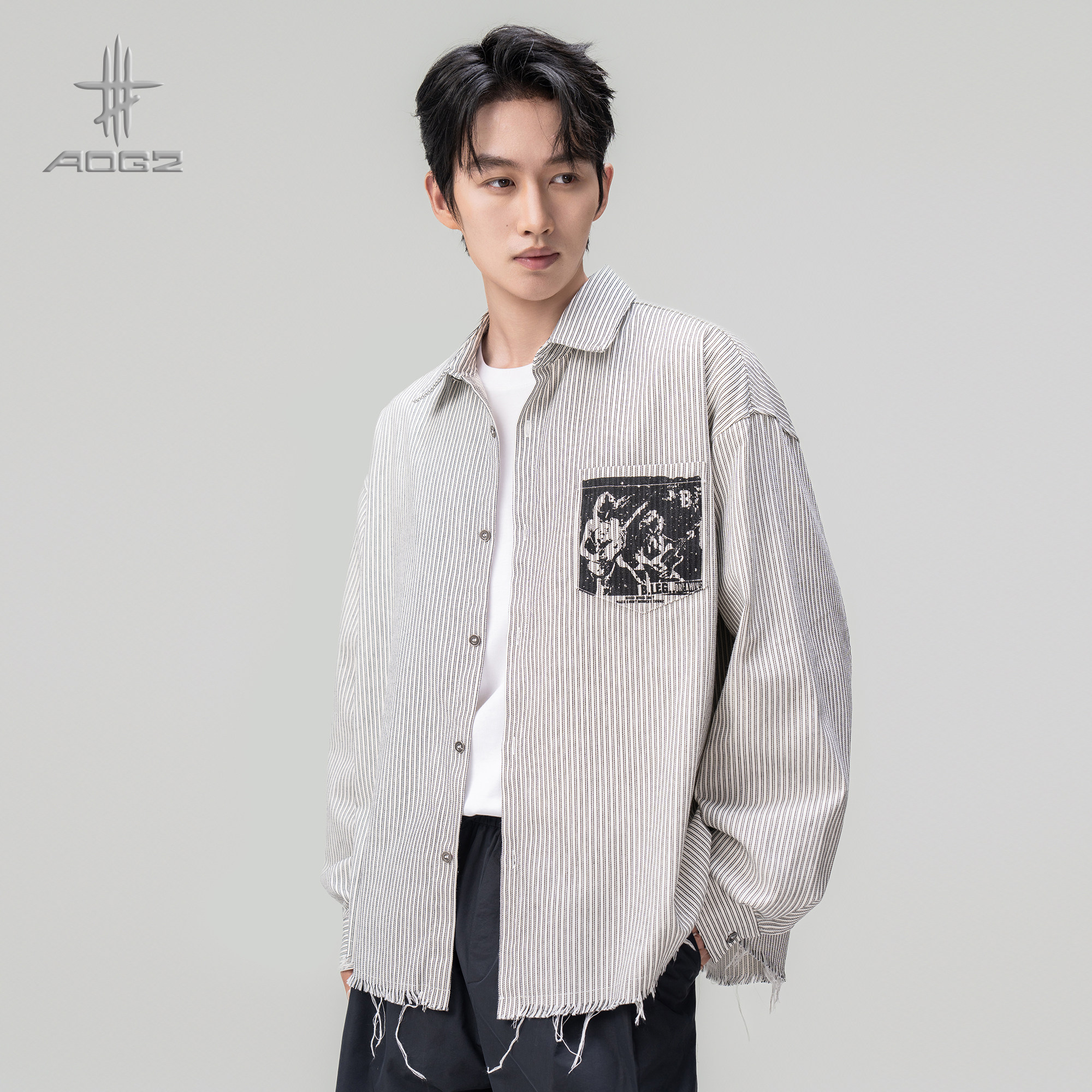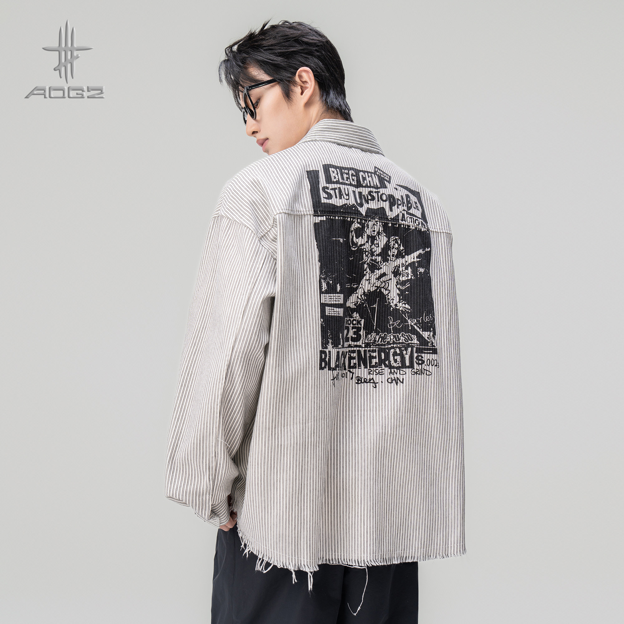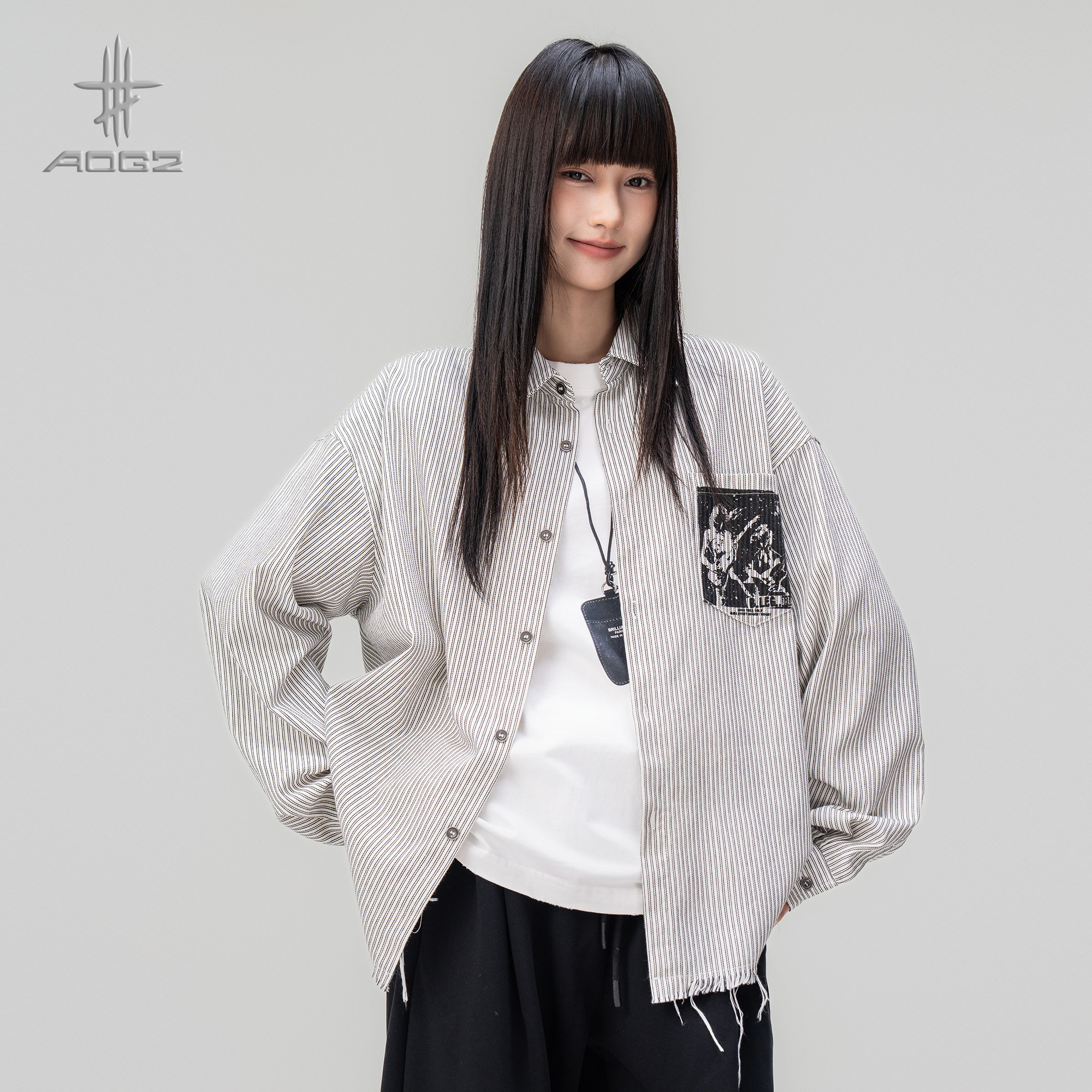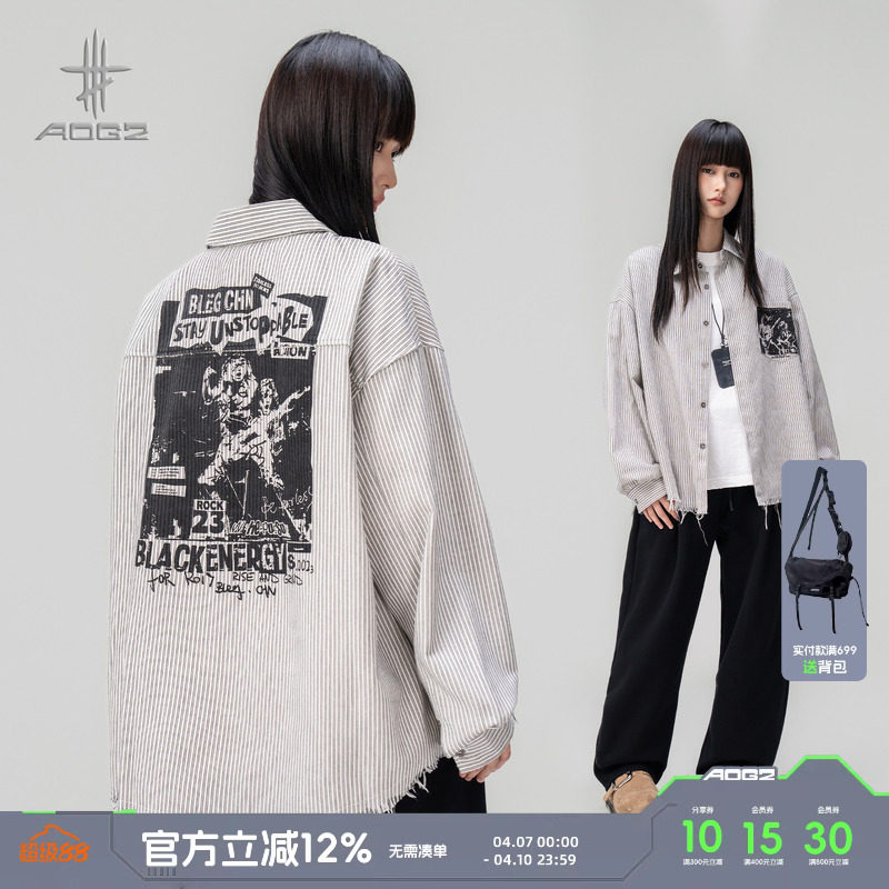 淘宝AOGZ美式复古乐队印花中性简约衬衫2026春新款男女竖条纹毛边外套