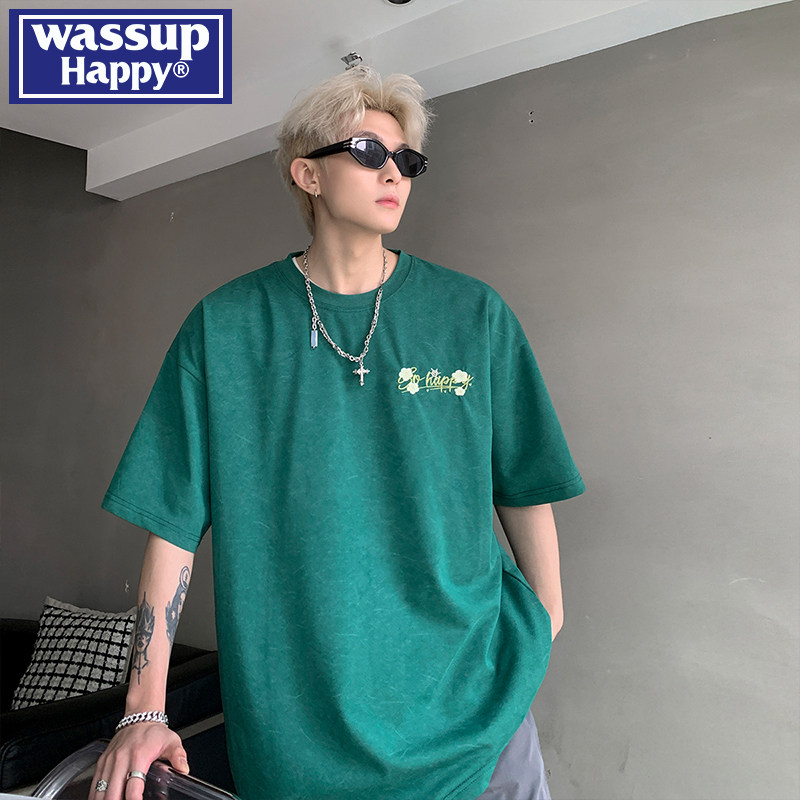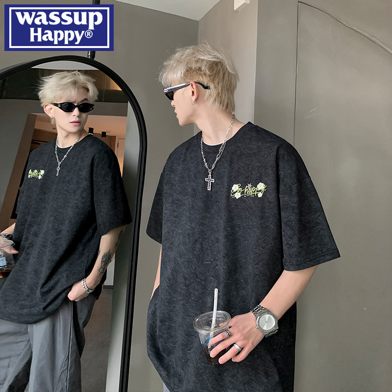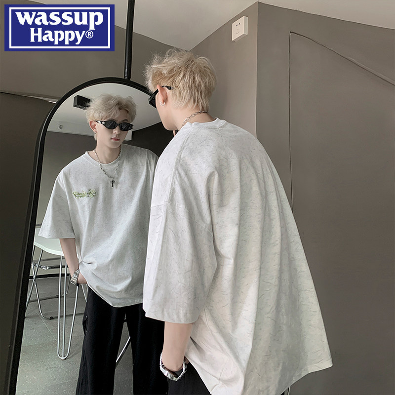 wassup happy刺绣圆领短袖t恤男夏季重磅休闲上衣宽松百搭五分袖