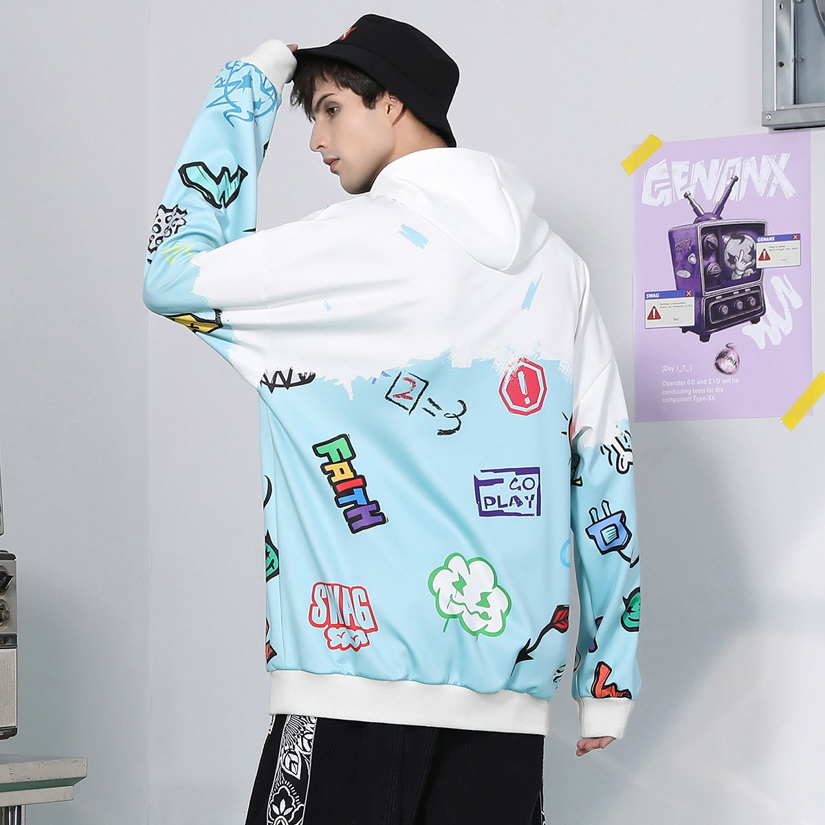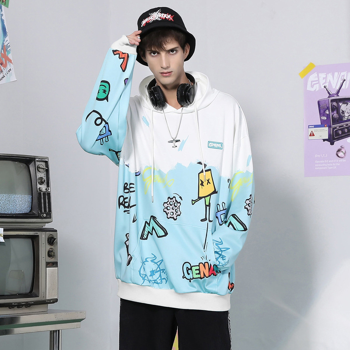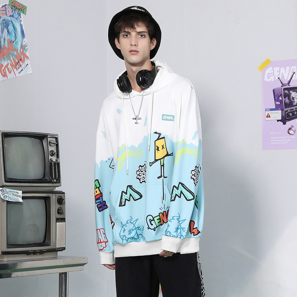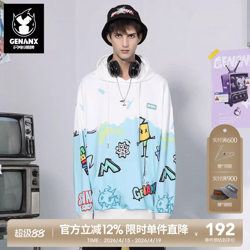 --------------------- GENANX闪电潮牌抽绳连帽卫衣涂鸦印花国潮袋鼠兜太空棉情侣装上衣 【原售价】269元 【现售价】192元 【推荐理由】