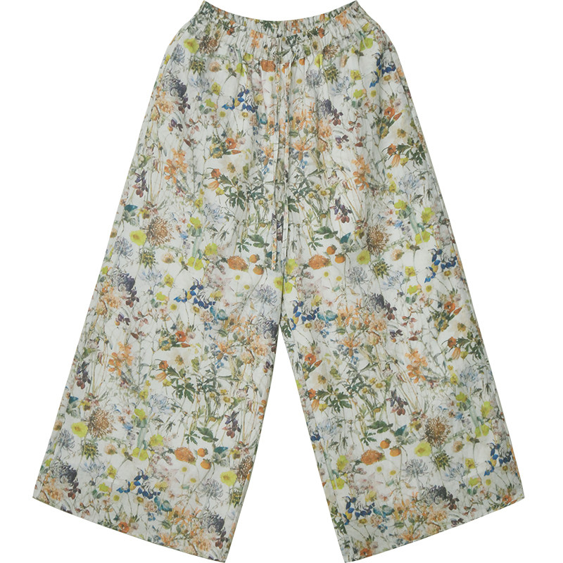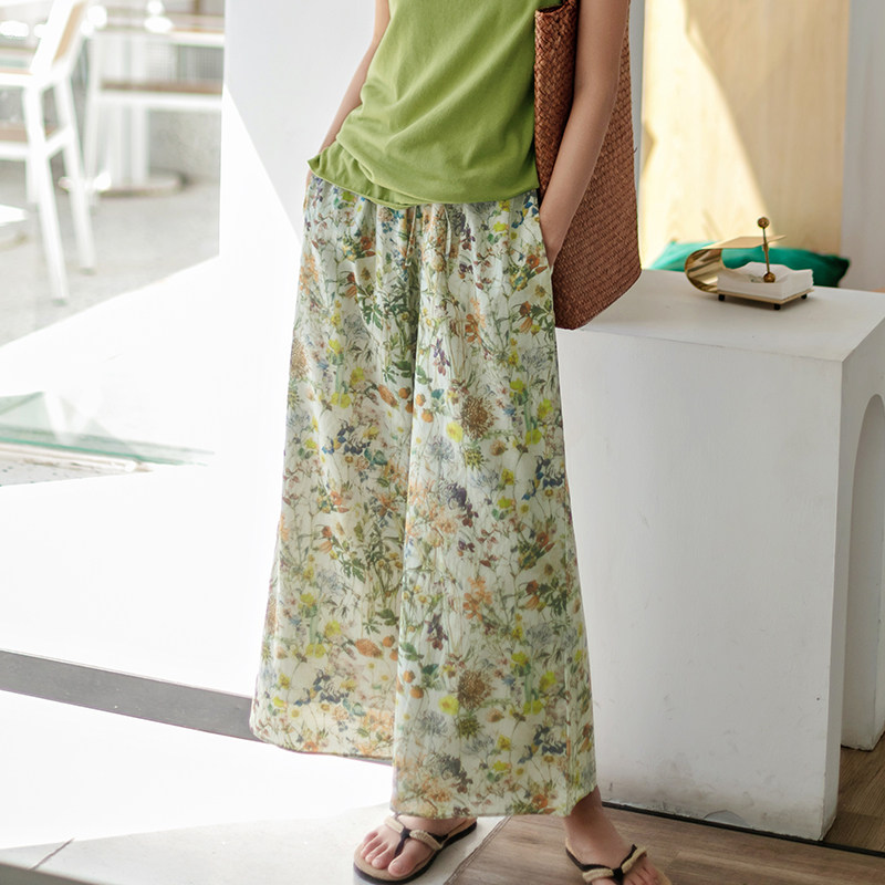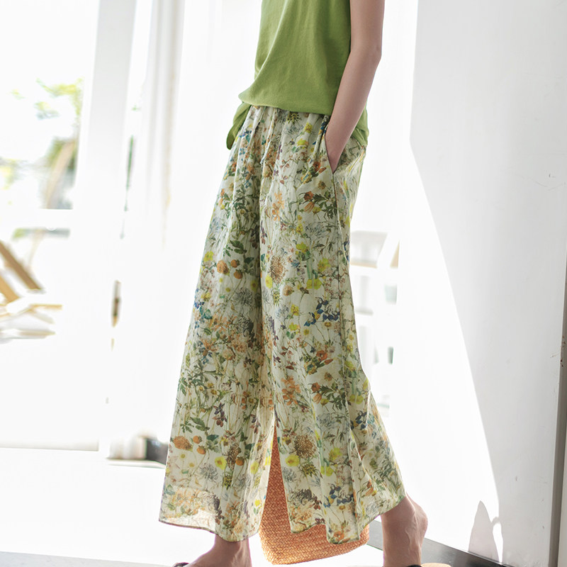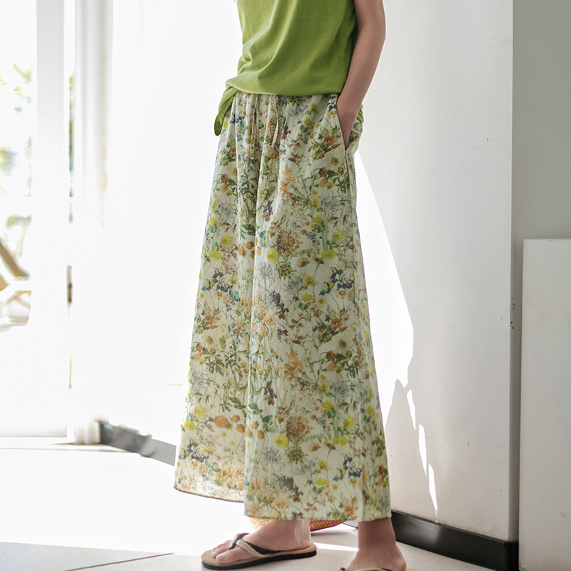 淘宝一非空间夏装新款文艺清新田园印花苎麻直筒裤长款裙裤休闲阔腿裤
