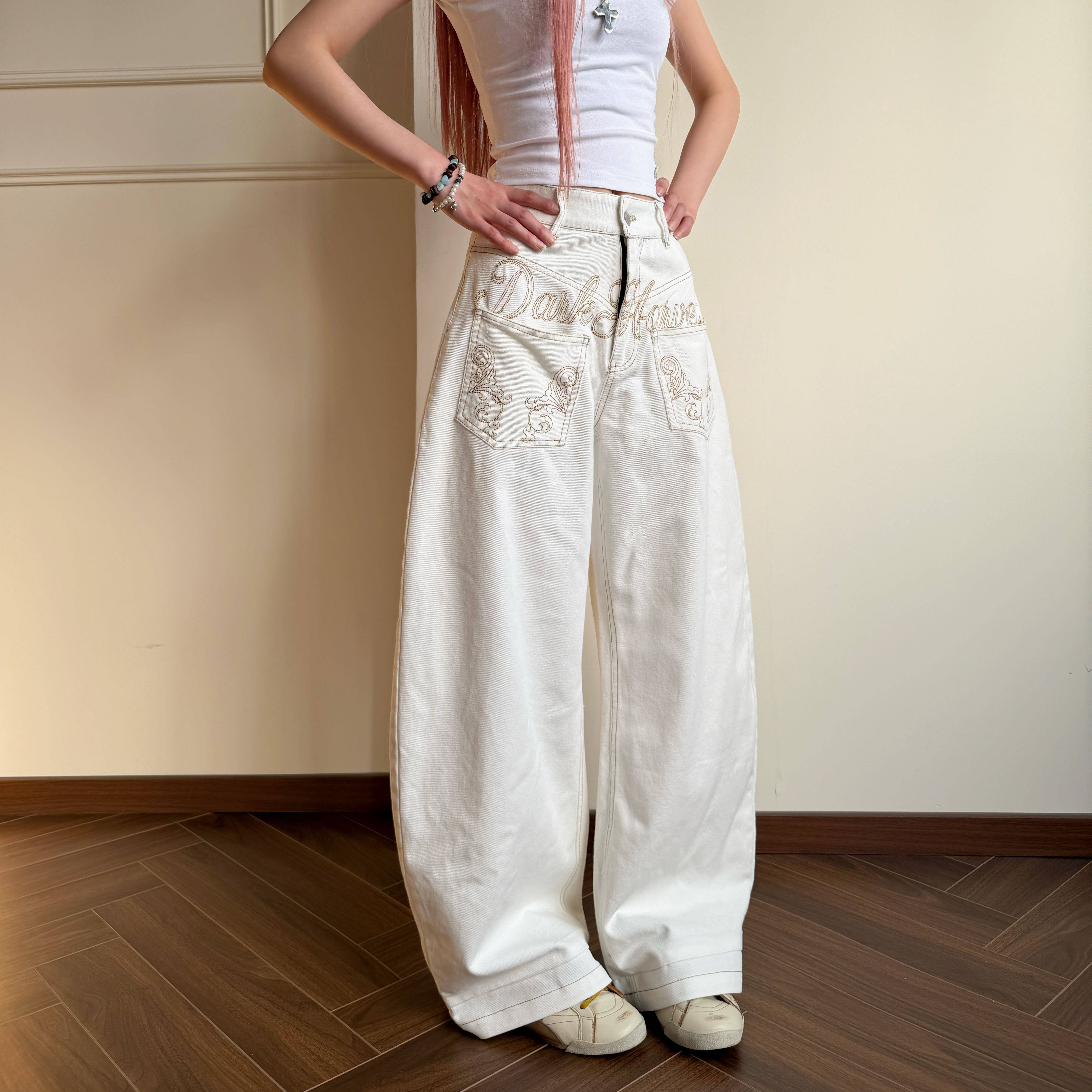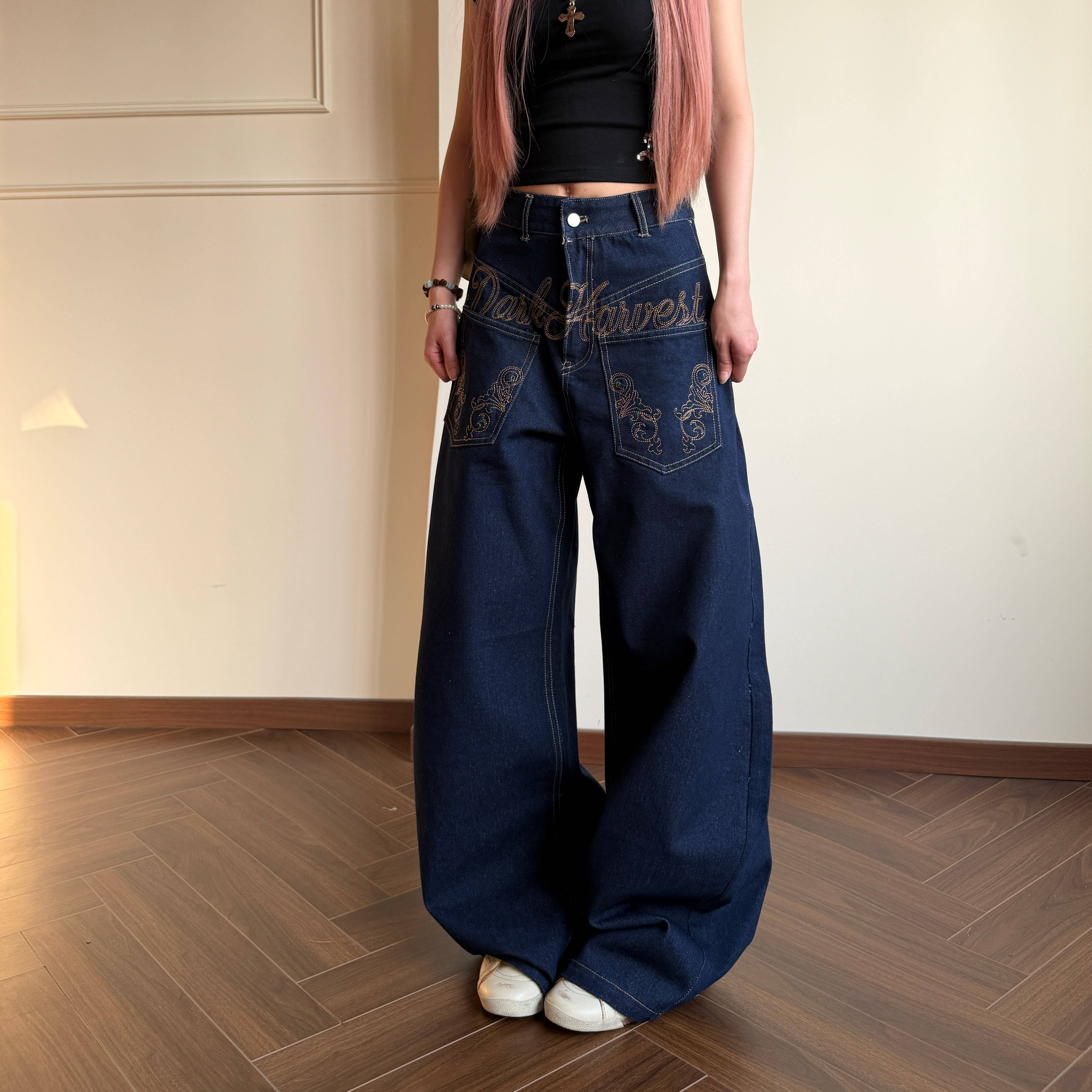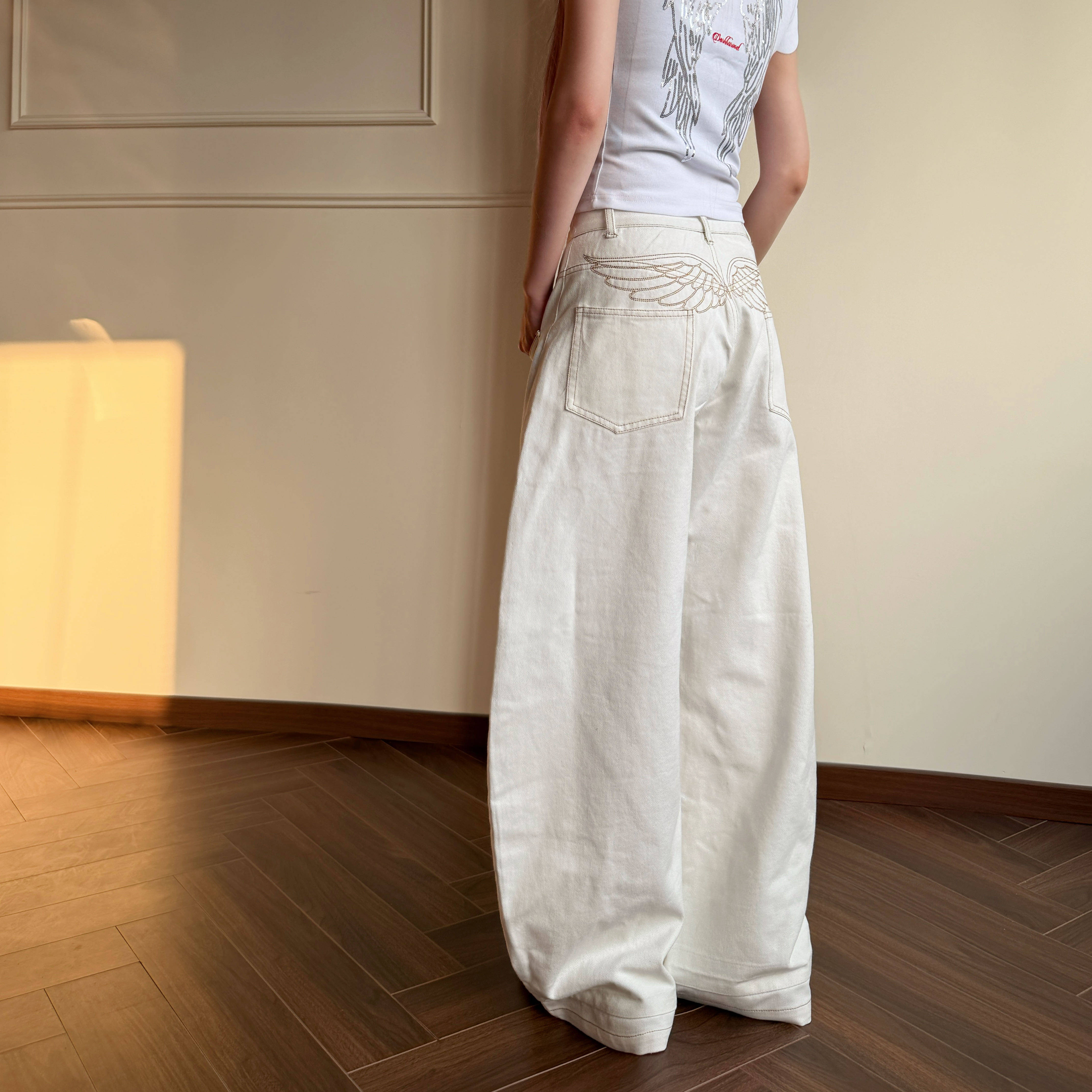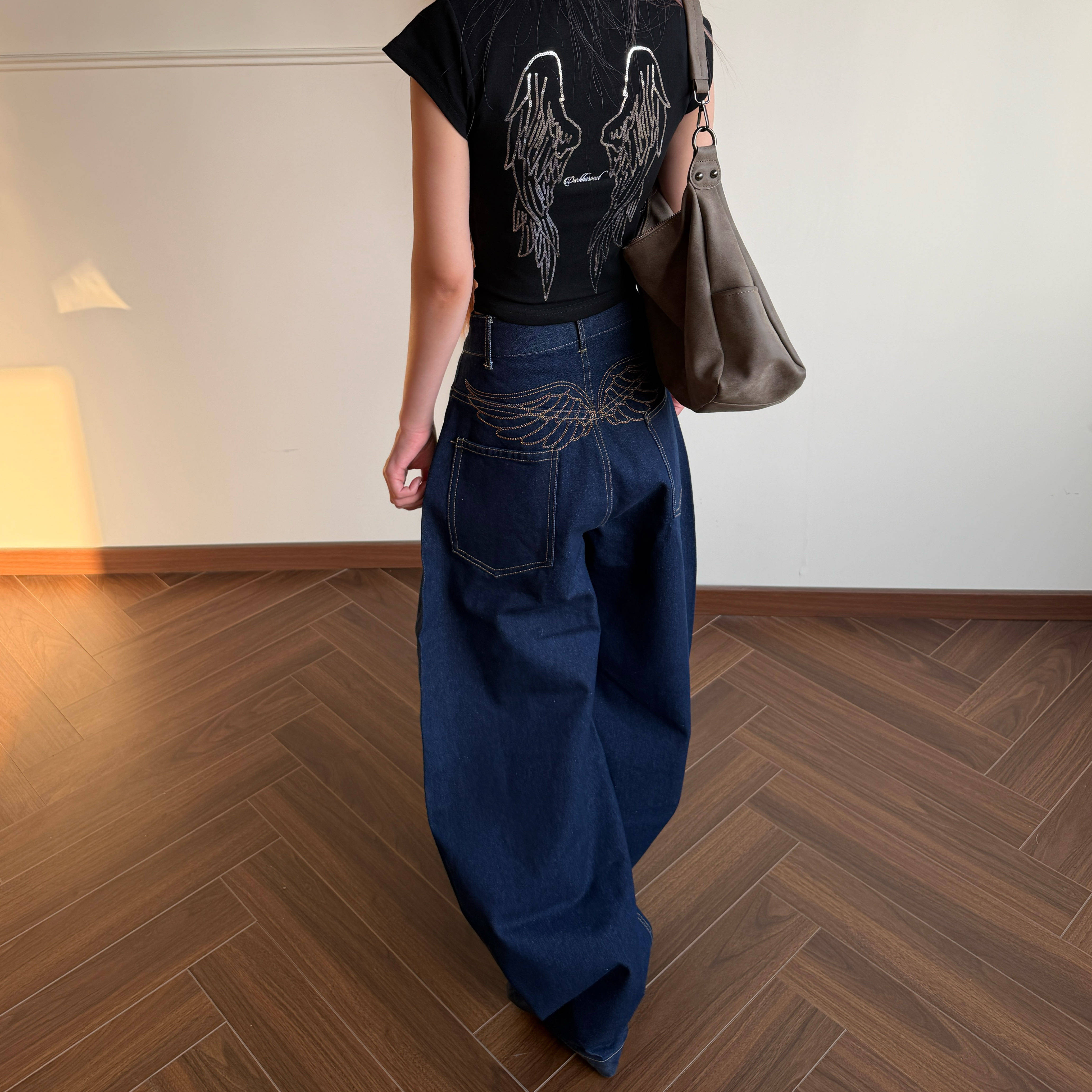 淘宝Amoeba美式复古设计感字母翅膀刺绣弯刀阔腿牛仔裤男女百搭长裤