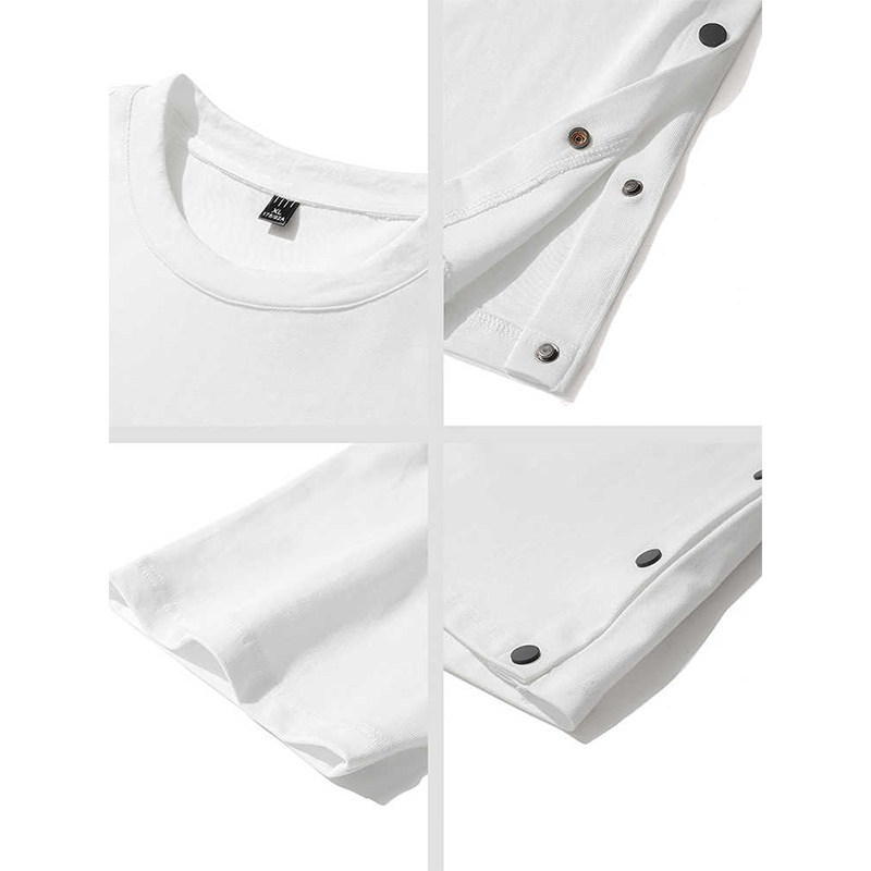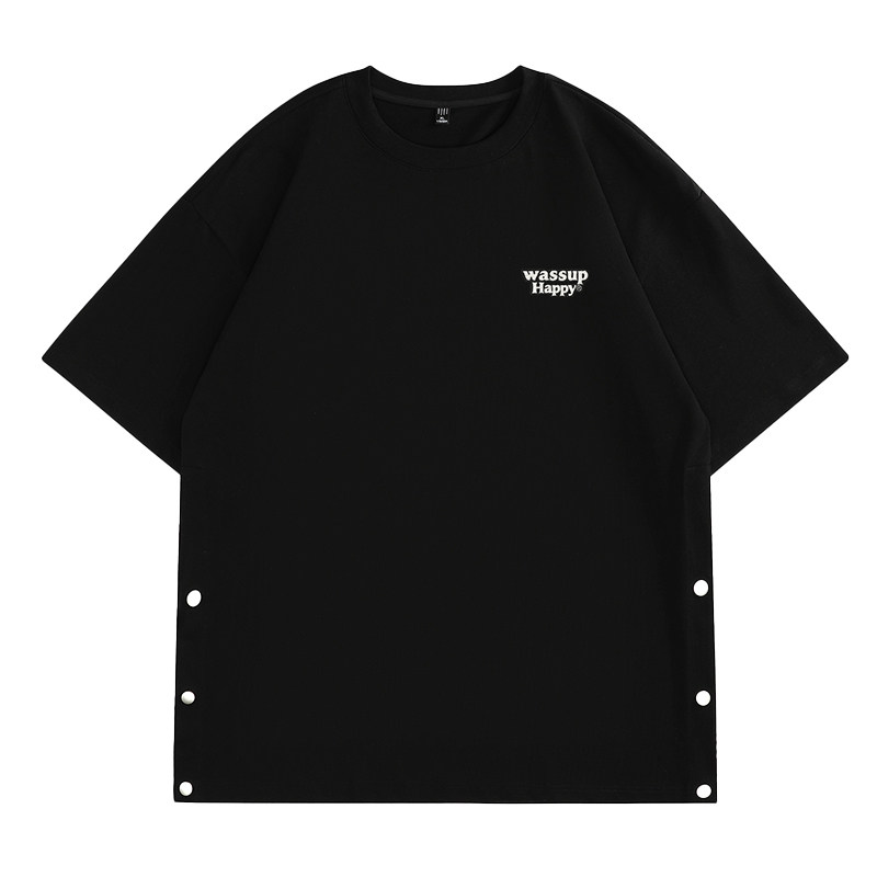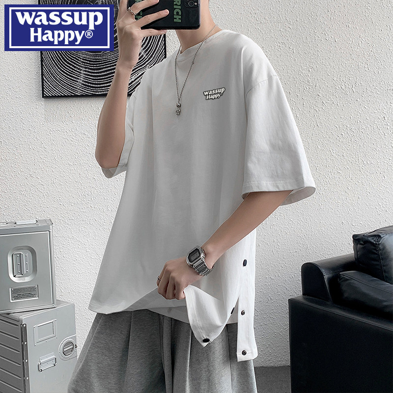淘宝wassup happy排扣短袖t恤男夏季宽松简约半袖美式休闲开衩体恤衫