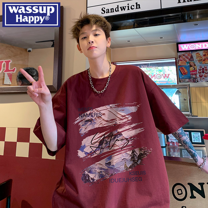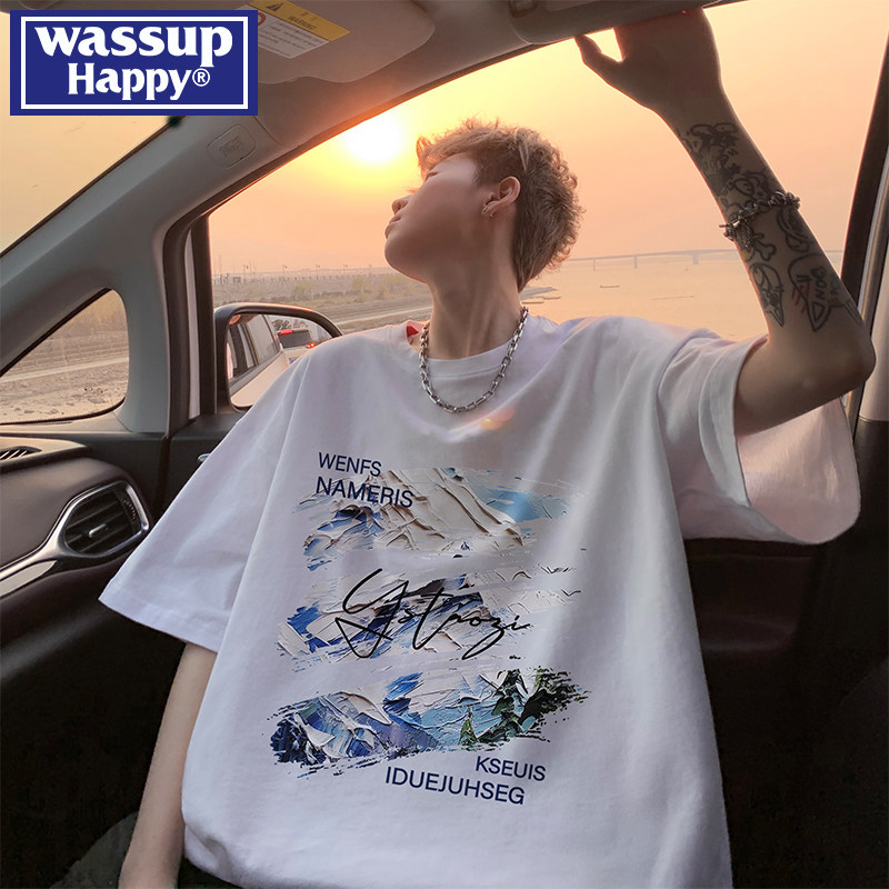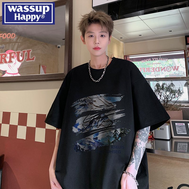 wassup happy圆领短袖t恤男夏季美式潮牌半袖青少年宽松休闲男装