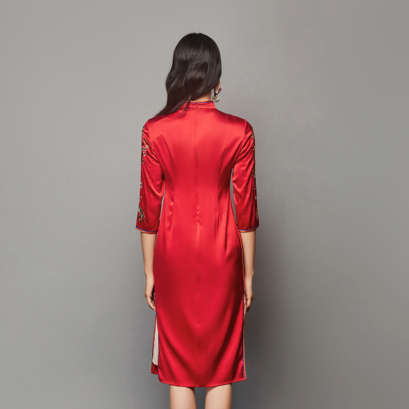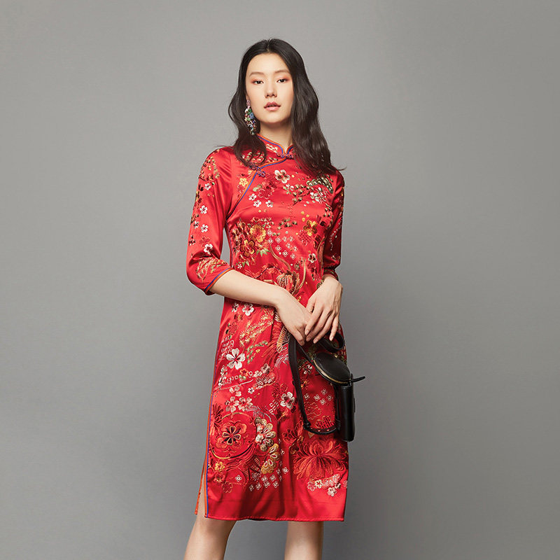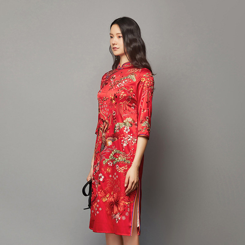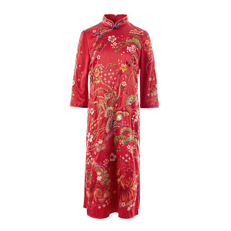 渔女装新款秋季真丝弹力国潮凤凰绣花收腰旗袍连衣裙FGFC0043
