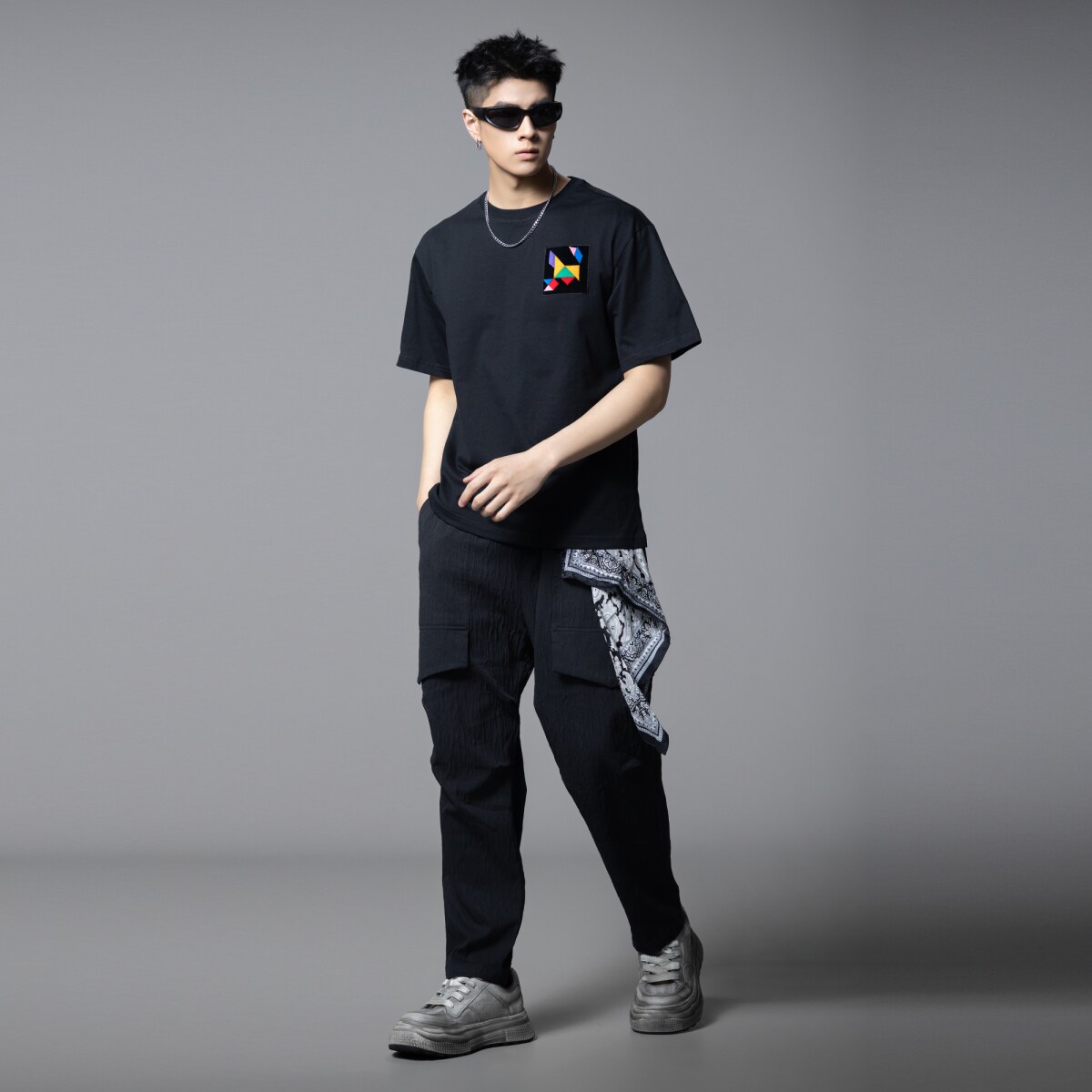 PINLI品立夏季新款男士贴布绣花落肩圆领短袖T恤BG252111046