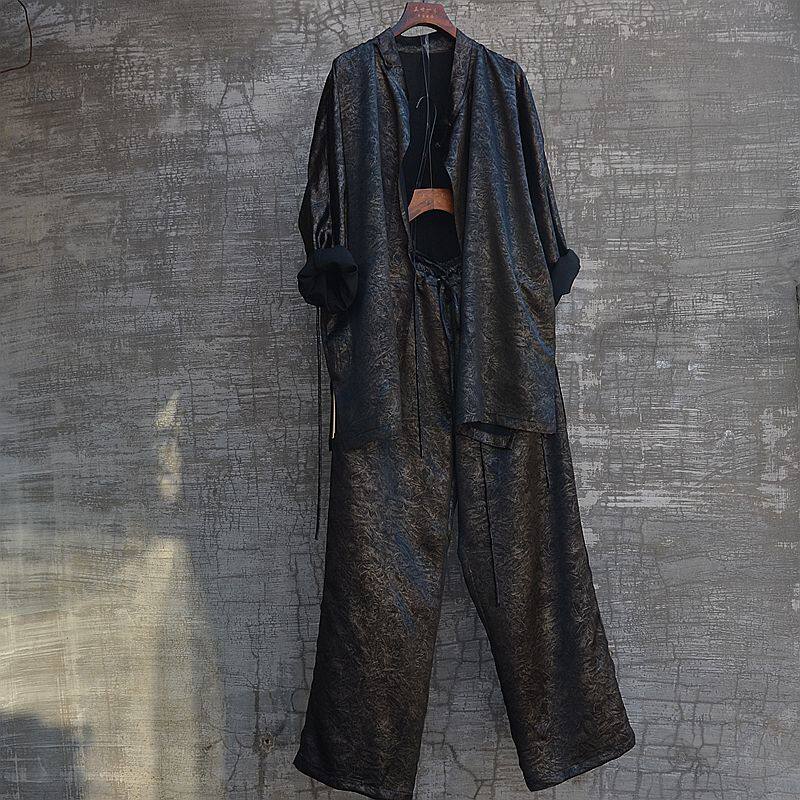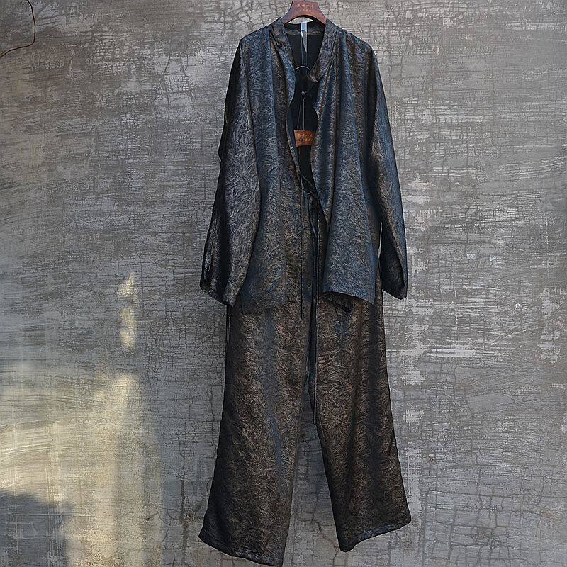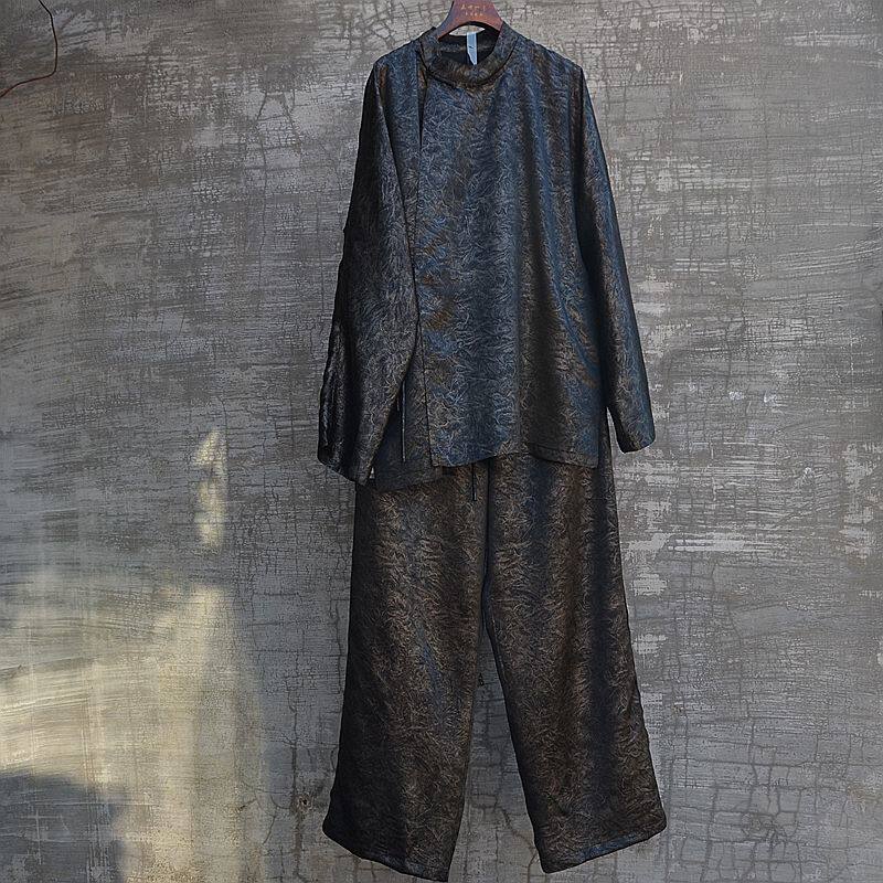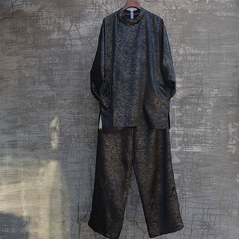 三世一木原创复古国潮顺滑醋酸唐装立领衬衫休闲直筒裤套装新中式