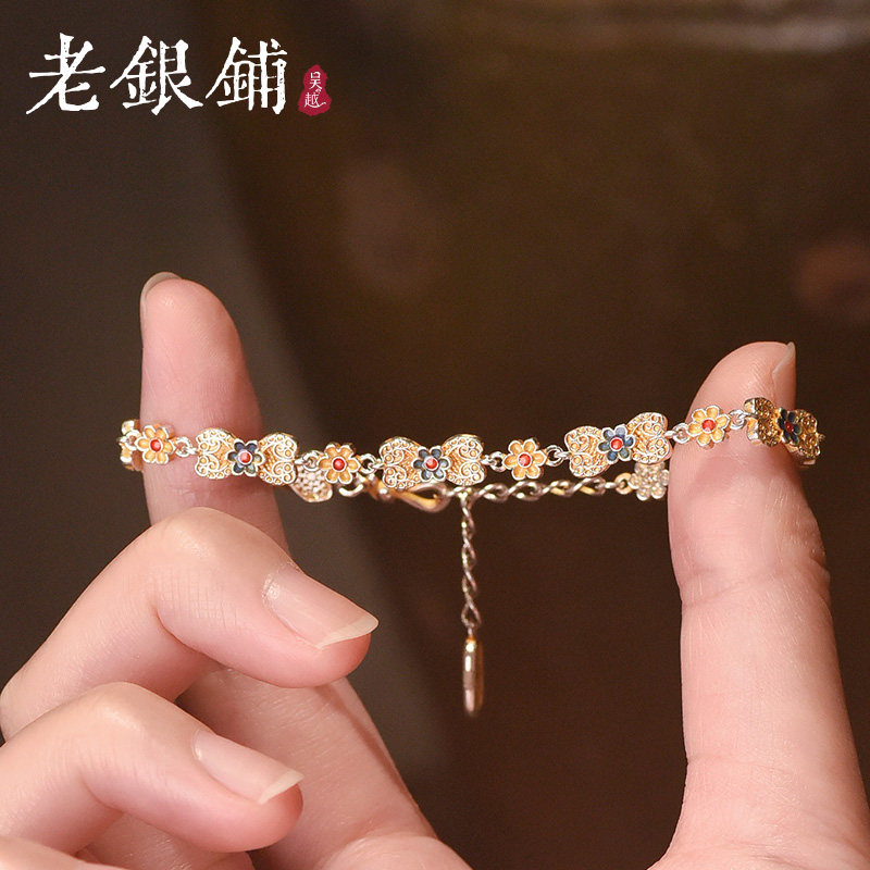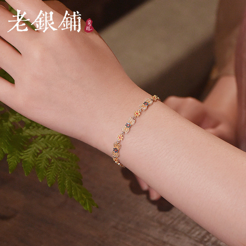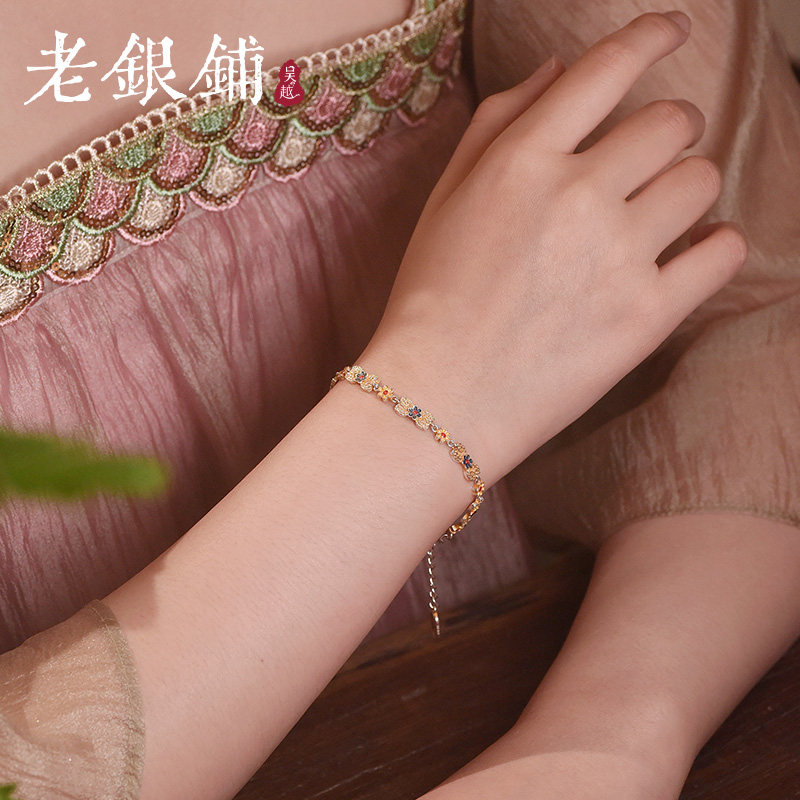 吴越老银铺足银9999捻花手链国潮气质珐琅彩银手链描金七夕节礼物