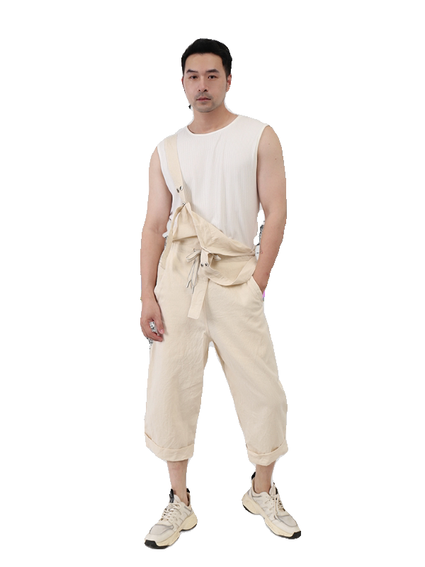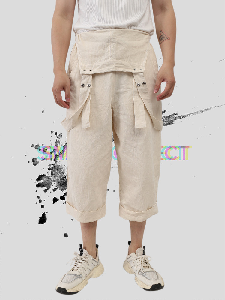 smelt炼设计师原色麻料 加大透气夏日两穿个性七分松紧腰背带裤男