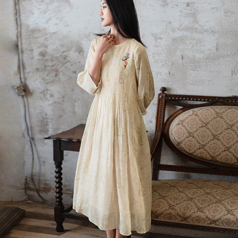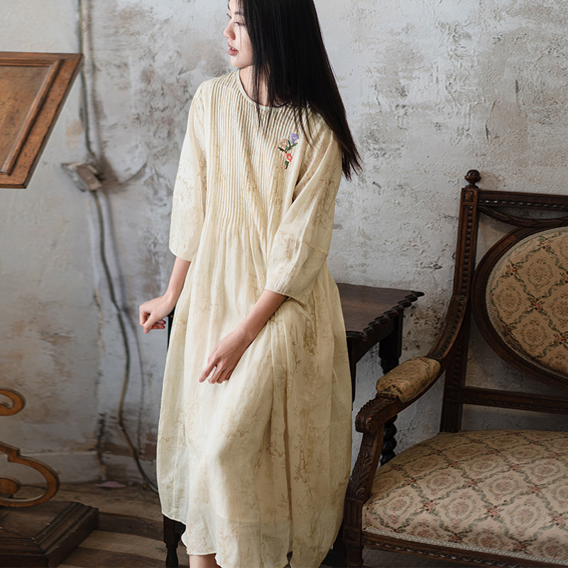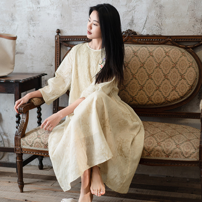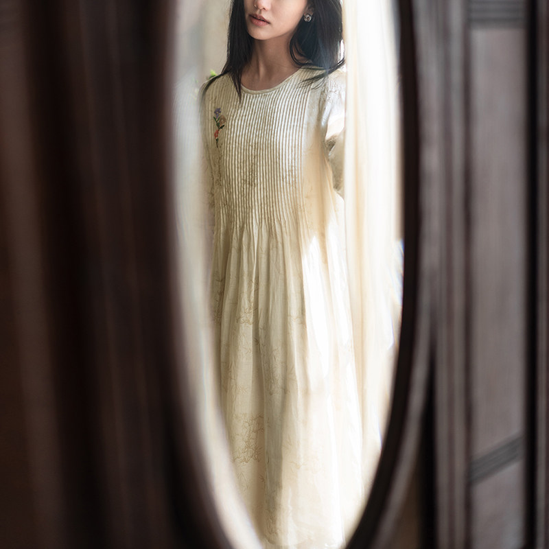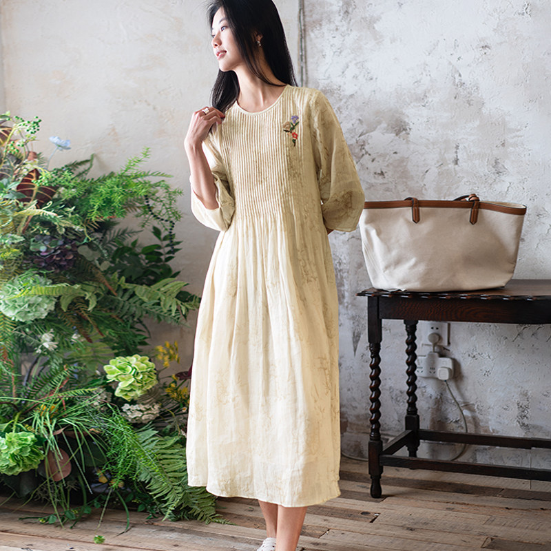 一非空间夏季新品高支苎麻连衣裙水溶刺绣风琴褶宽松显瘦度假长裙