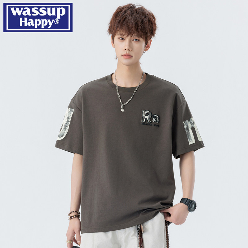 wassup happy美式字母印花圆领短袖t恤男夏季宽松潮流百搭体恤衫