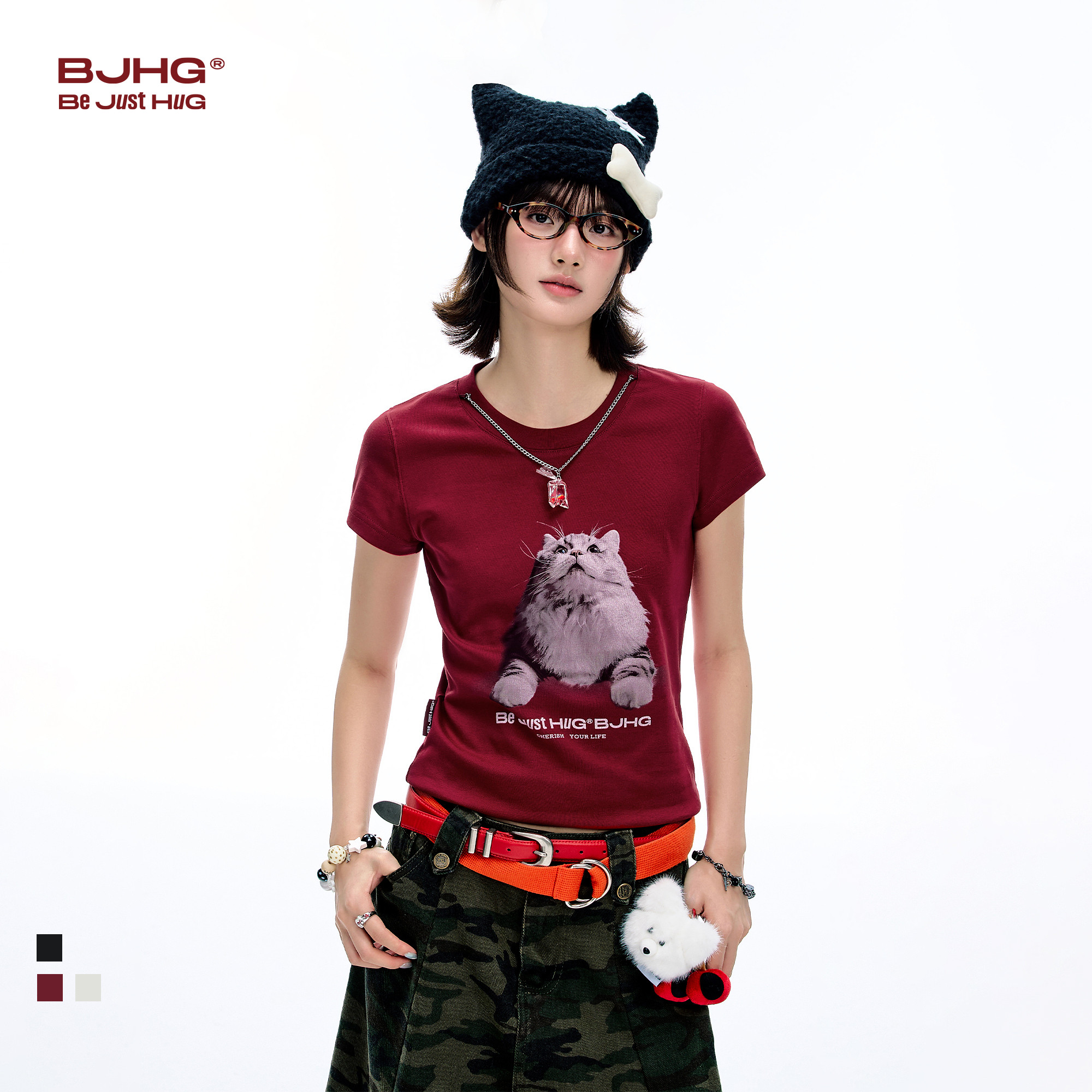BJHG不计后果小猫抓鱼T恤短袖女款夏季修身上衣半袖凉感正肩t恤女