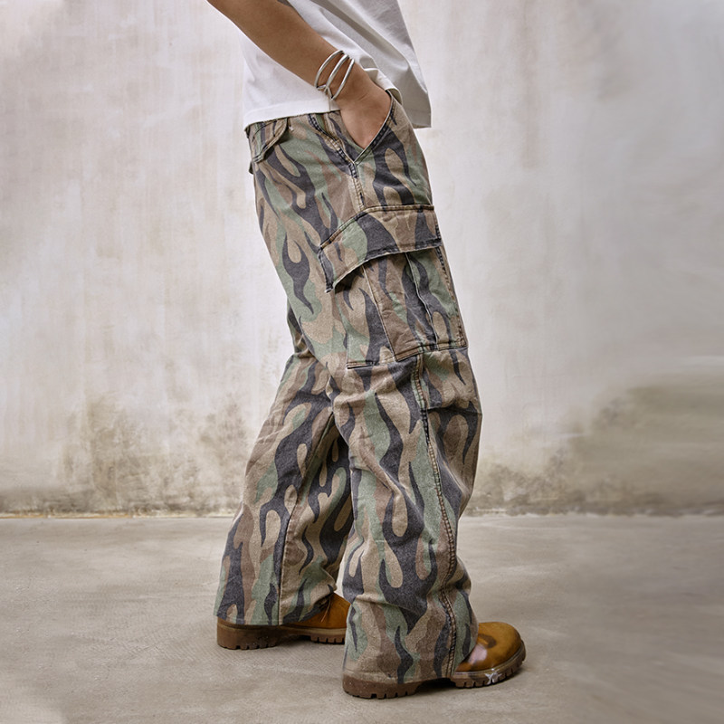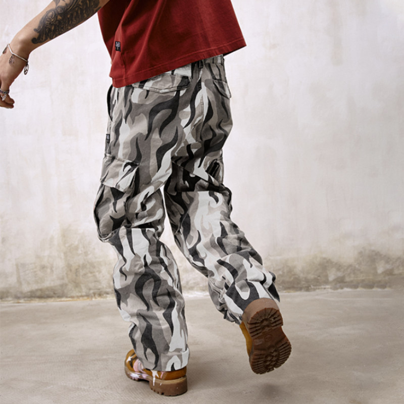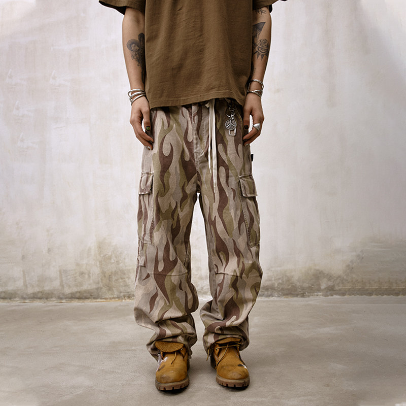 Remedy秋季国潮宽松直筒工装长裤子美式潮牌磨边火焰迷彩休闲裤男