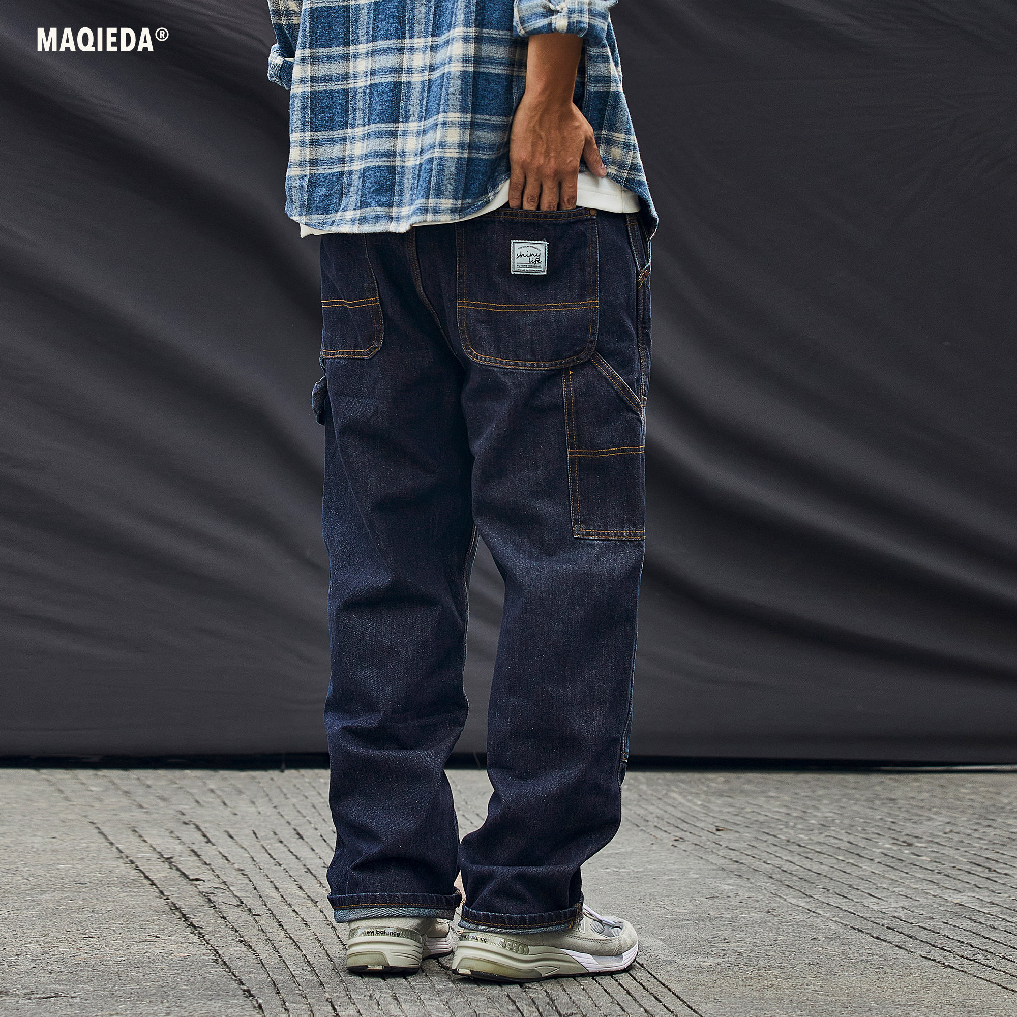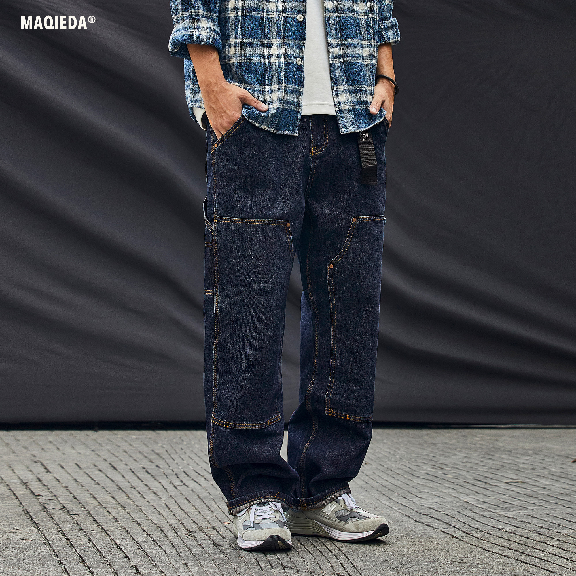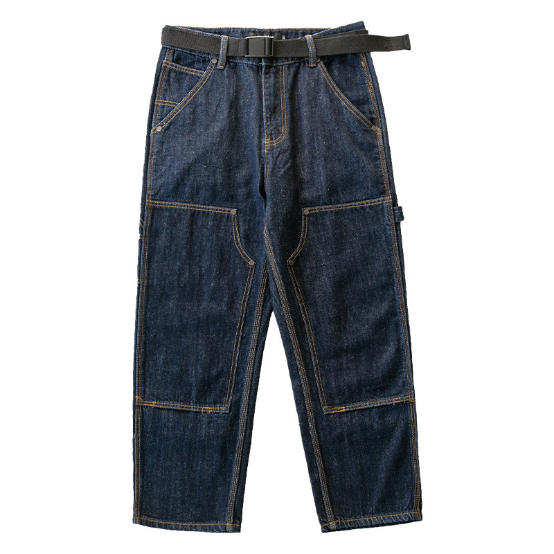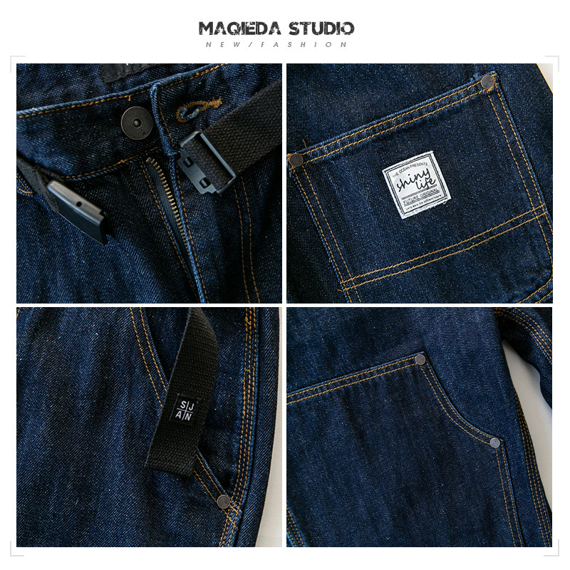 马切达春季设计感铆钉拼布牛仔裤男士直筒休闲长裤腰带宽松裤子潮