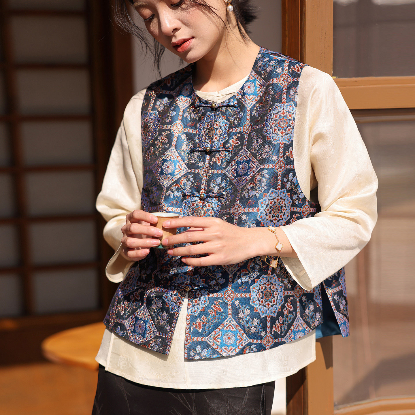 淘宝菲伊唐中式国潮马甲真丝宋锦复古改良对襟圆领中式宽松马夹女上衣