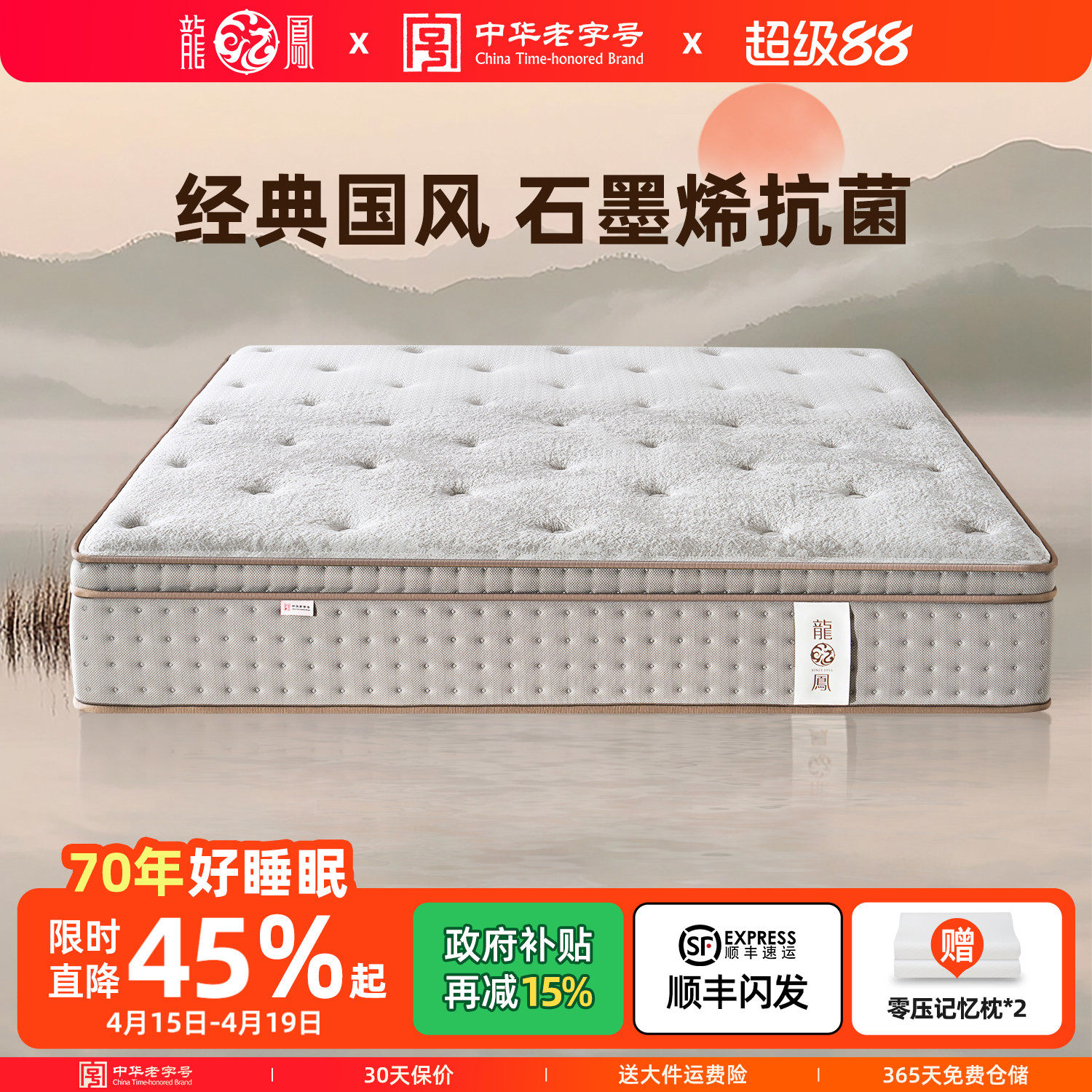 --------------------- 龙凤床垫 国潮风生态黄麻护脊偏硬天然乳胶弹簧床垫席梦思 焕梦 --------------------- --------------------- 【原价】4480元 【券后价】3042元