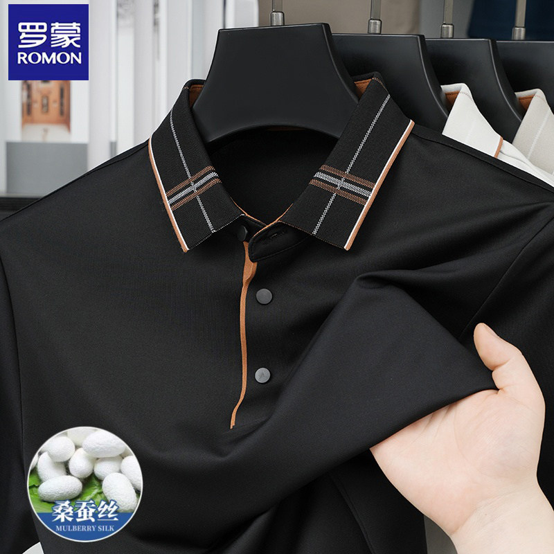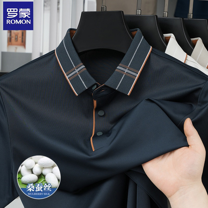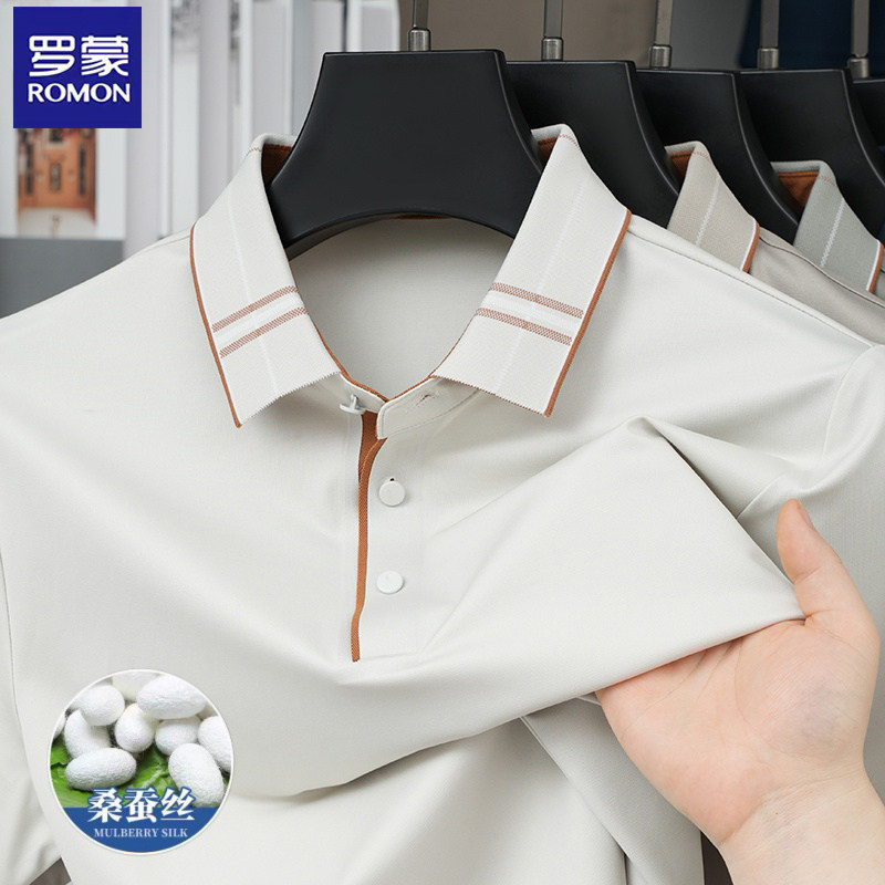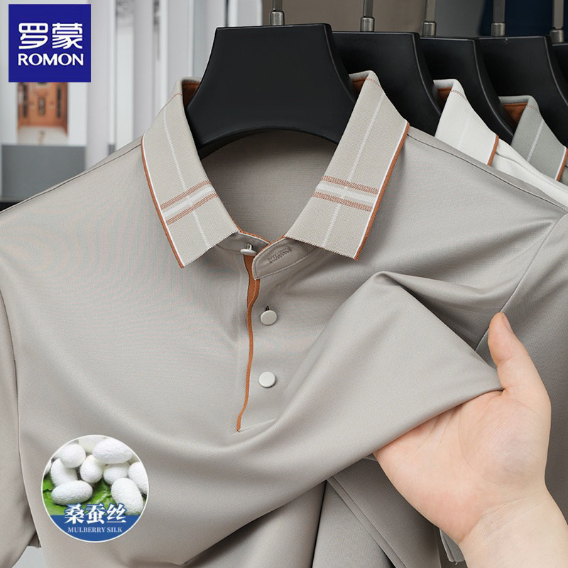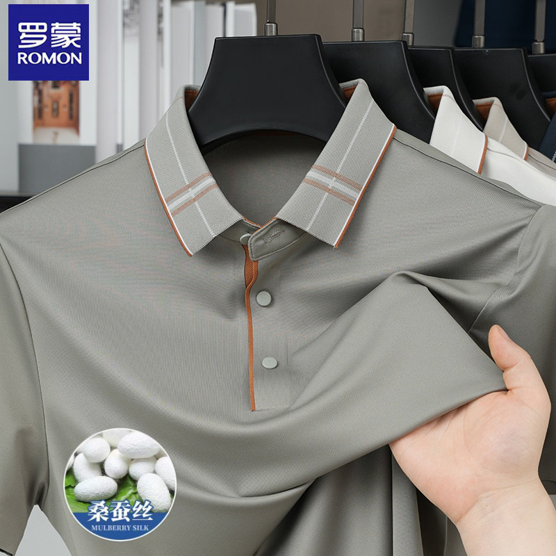 罗蒙桑蚕丝翻领polo衫男士纯色短袖商务休闲凉感T恤透气上衣
