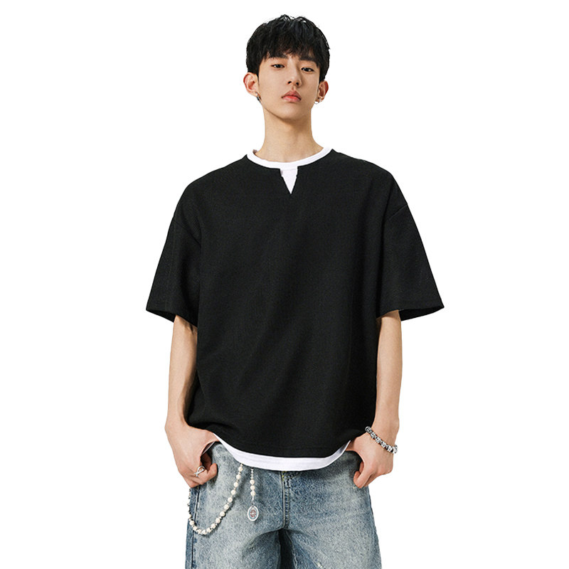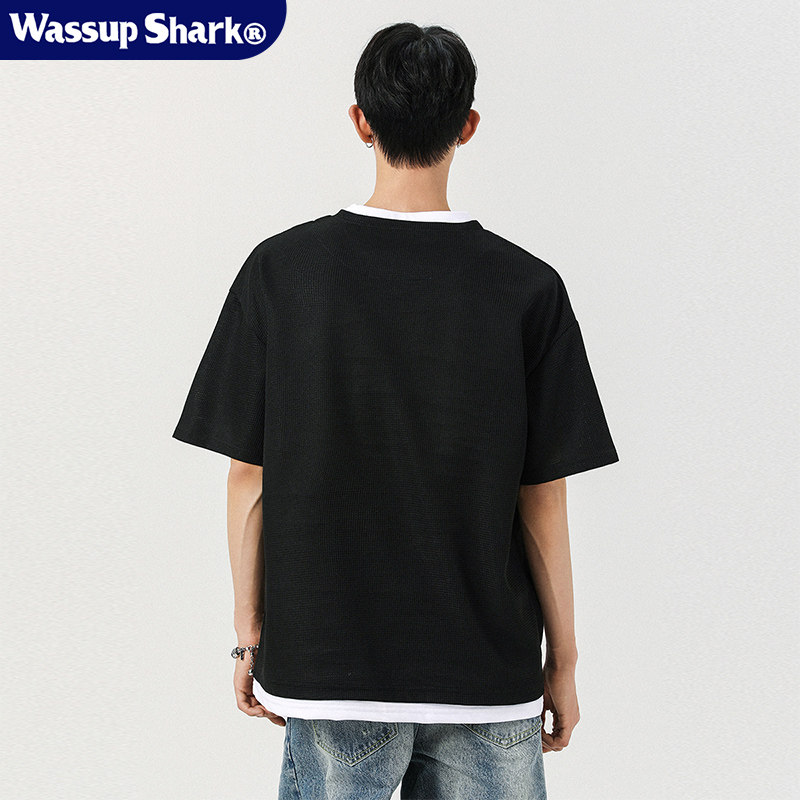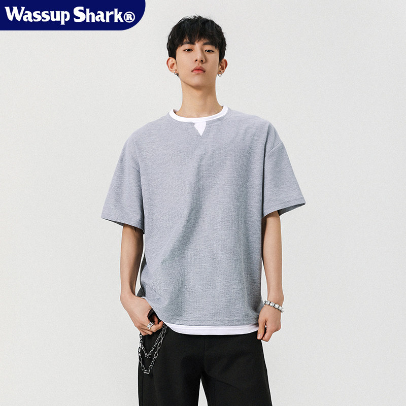 Wassup Shark潮牌V领假两件华夫格短袖t恤男夏季休闲百搭宽松上衣