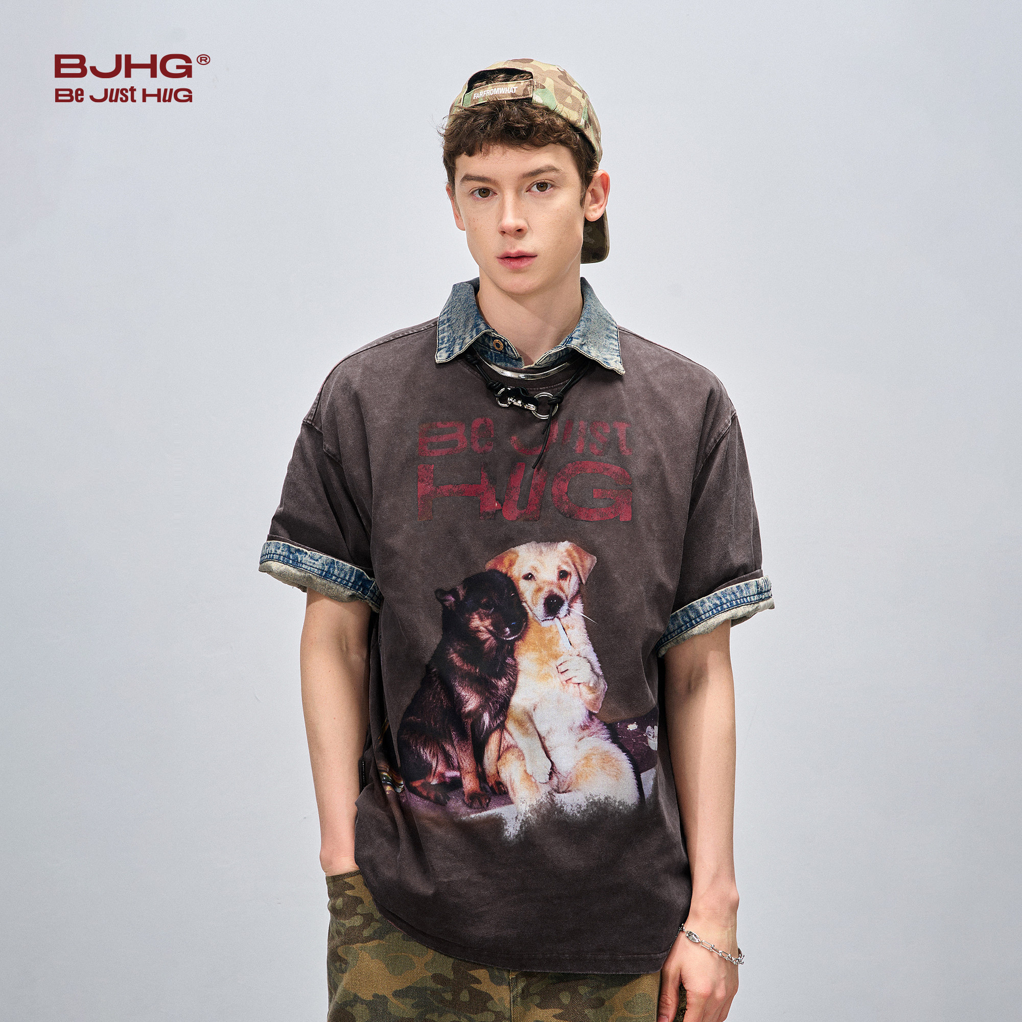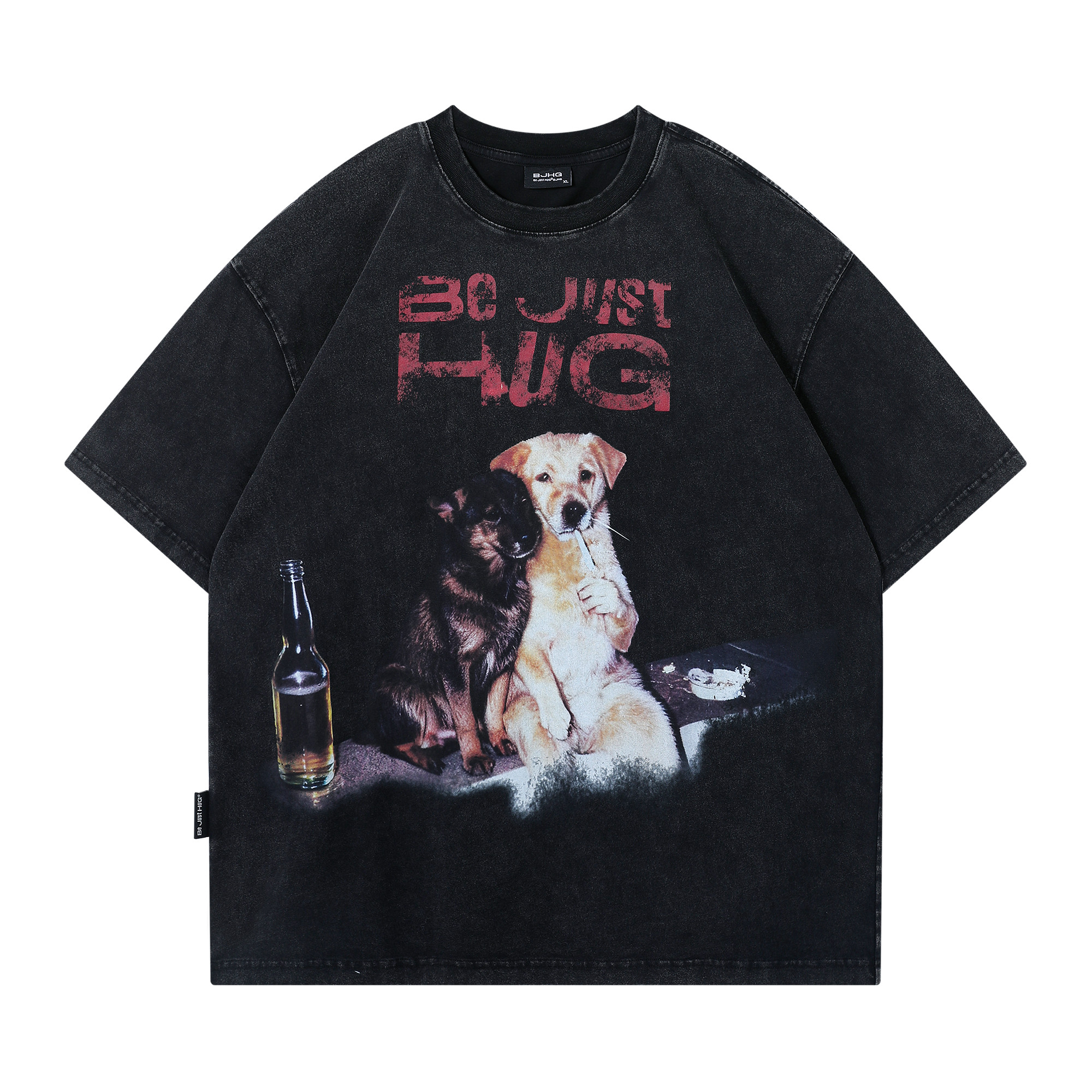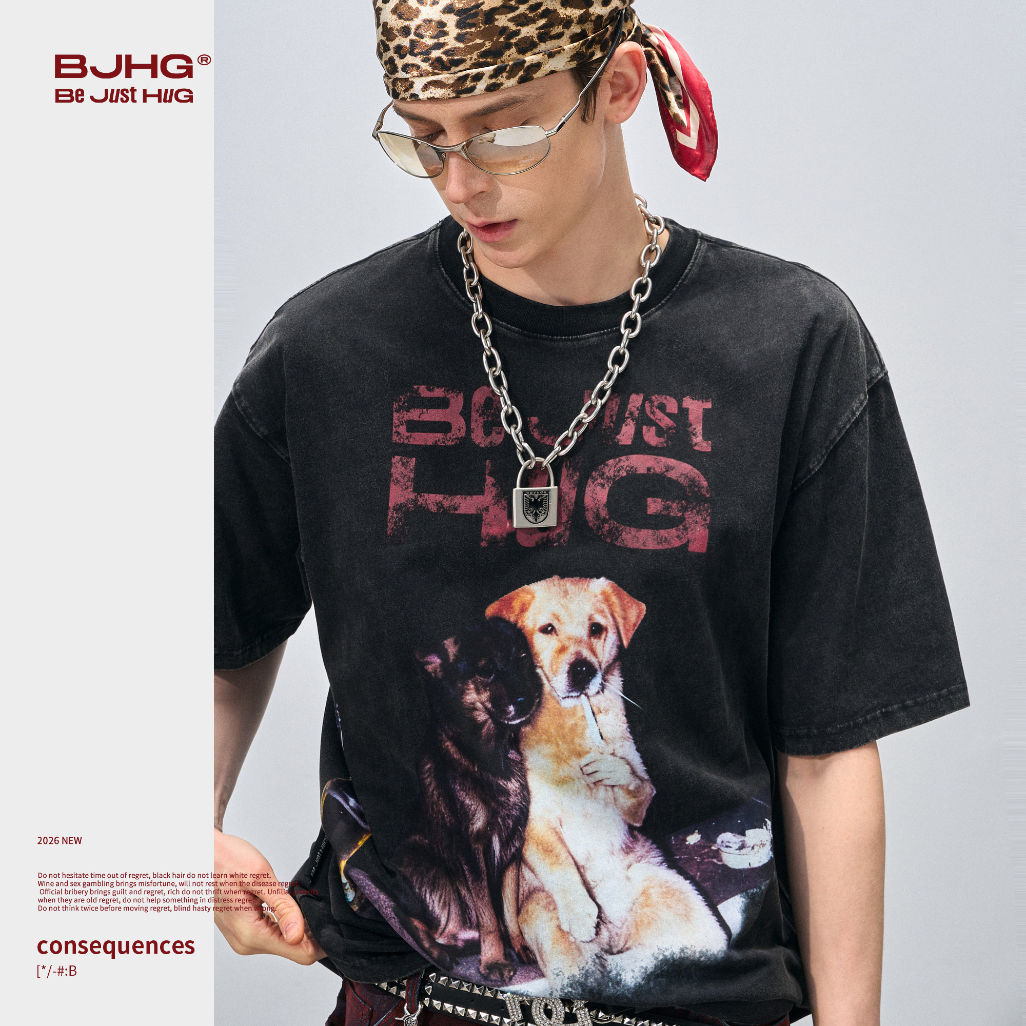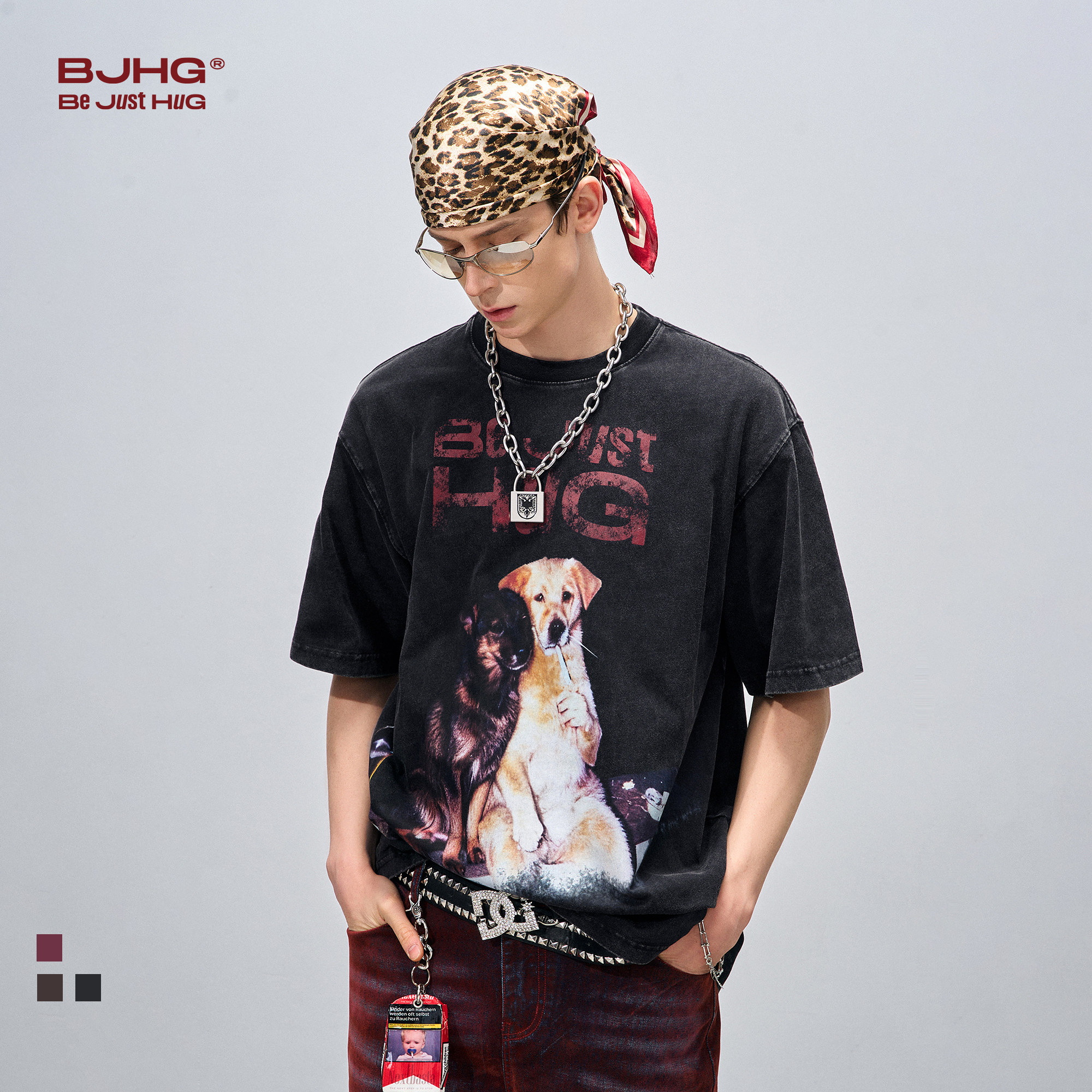 BJHG不计后果小狗T恤短袖男款夏季美式水洗做旧纯棉情侣款短袖女