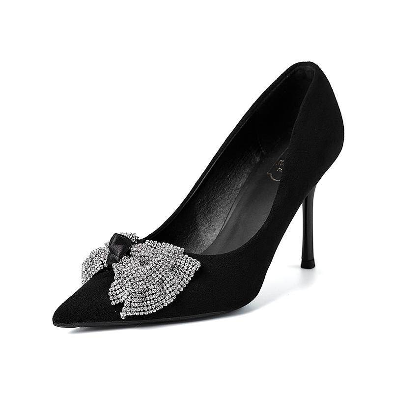 --------------------- 苏妃妃高跟鞋女黑色蝴蝶结细跟新款法式百搭水钻性感尖头单鞋 【原售价】156元 【现售价】137元 【推荐理由】