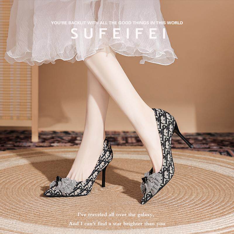 苏妃妃高跟鞋女黑色蝴蝶结细跟新款法式百搭水钻性感尖头单鞋
