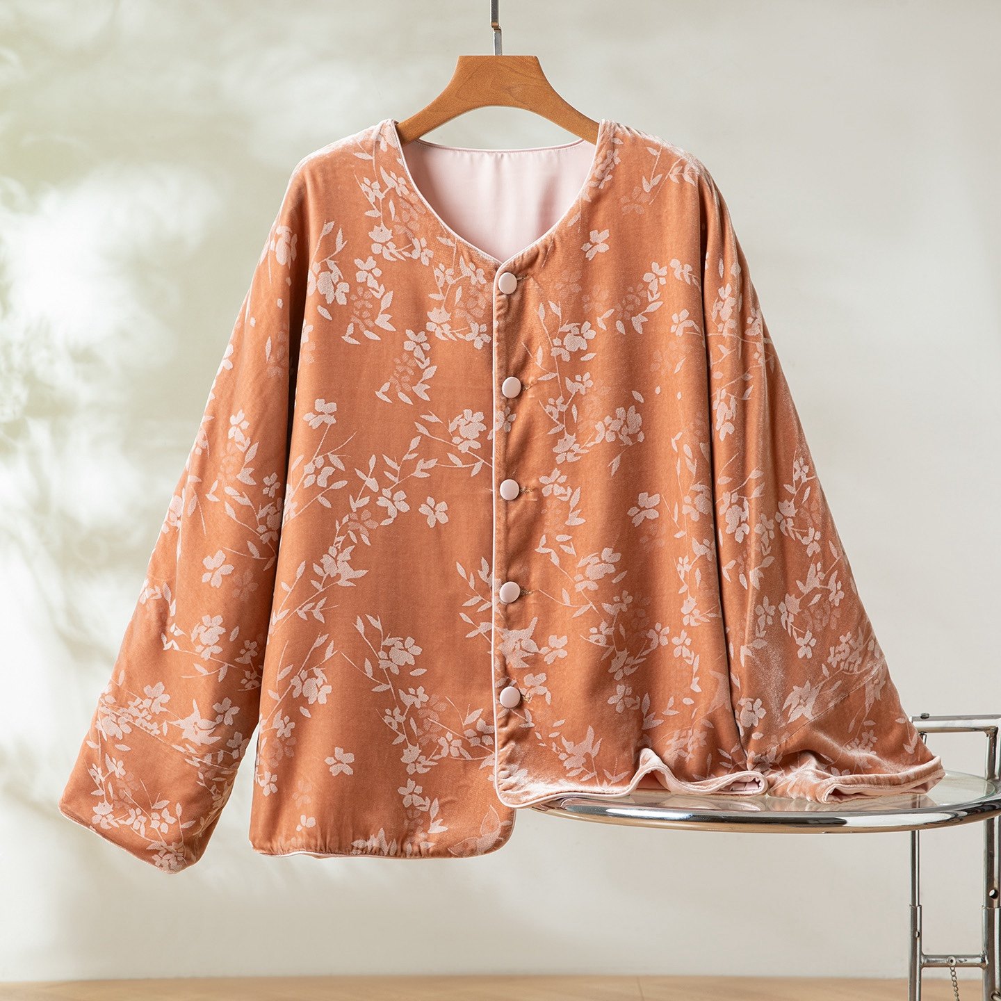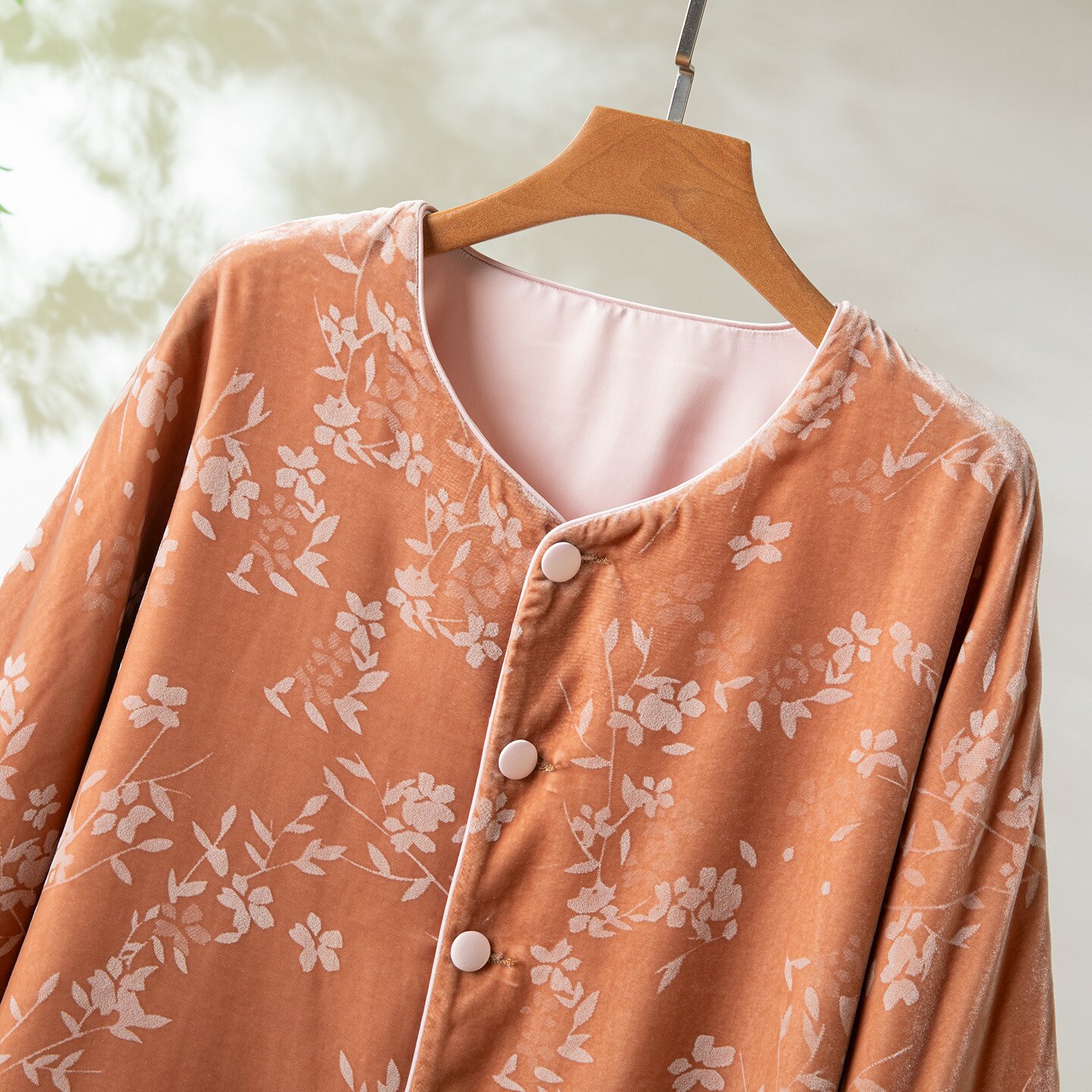 --------------------- 复古桑蚕丝丝绒压花中式国潮风外套女气质轻奢时尚显瘦长袖上衣 【原售价】309元 【现售价】262元 【推荐理由】