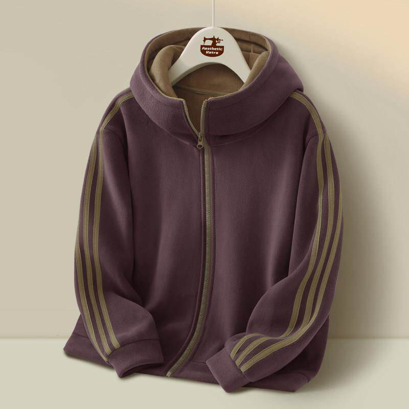 酱紫色条纹卫衣连帽外套女士秋冬季加绒加厚2025新款妈妈拉链上衣