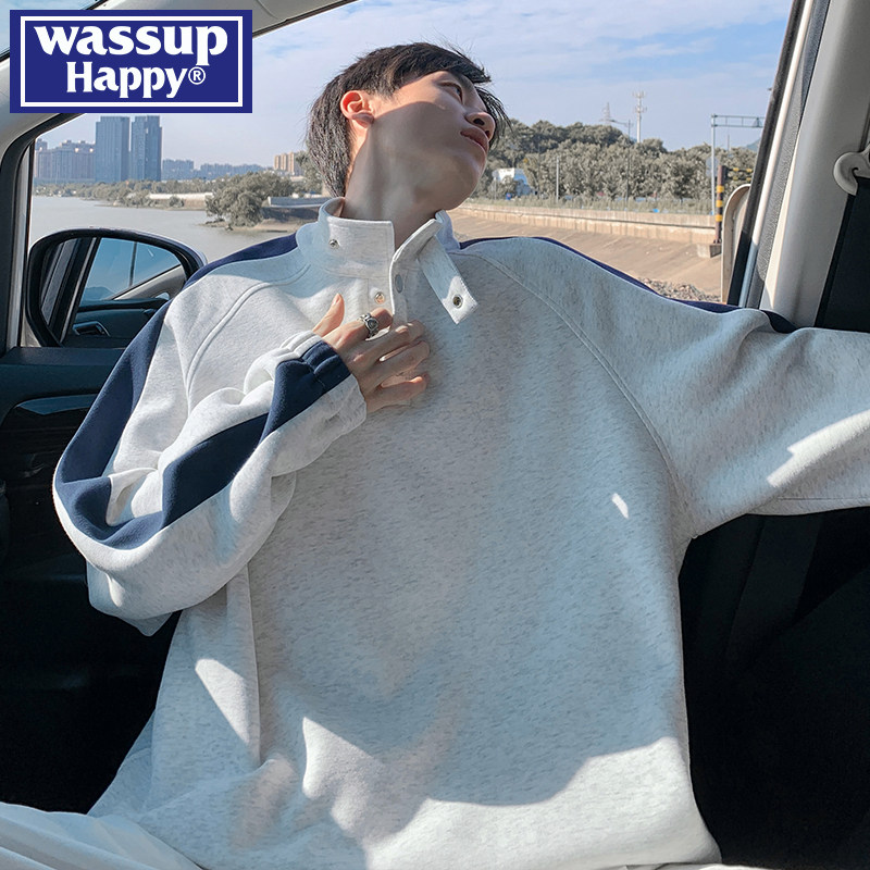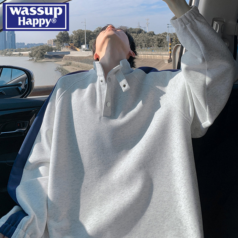 wassup happy美式高街撞色排扣卫衣男春秋季新款宽松休闲立领上衣