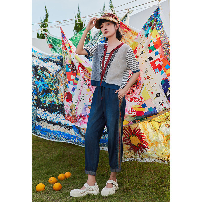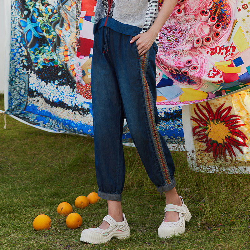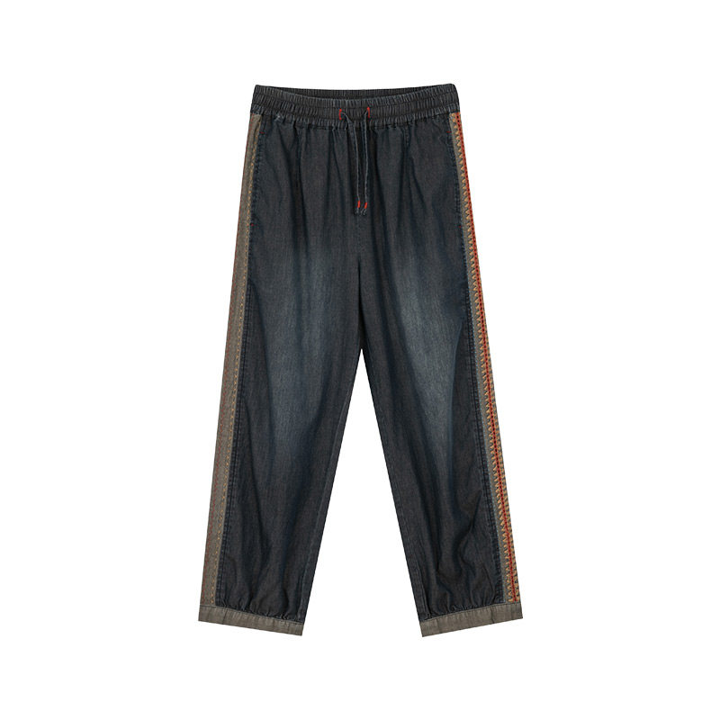 一城画一夏季国潮休闲裤宽松抽绳松紧腰设计长牛仔裤女