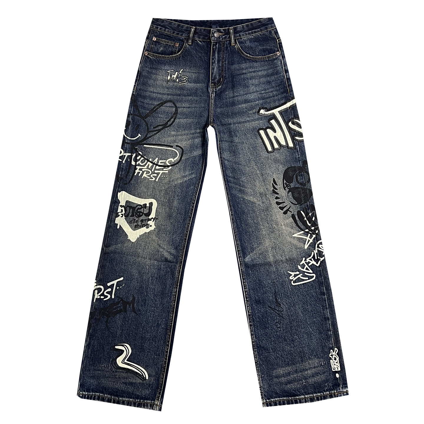 潮牌卡通涂鸦牛仔裤男复古做旧宽松直筒裤个性印花街头风痞帅长裤