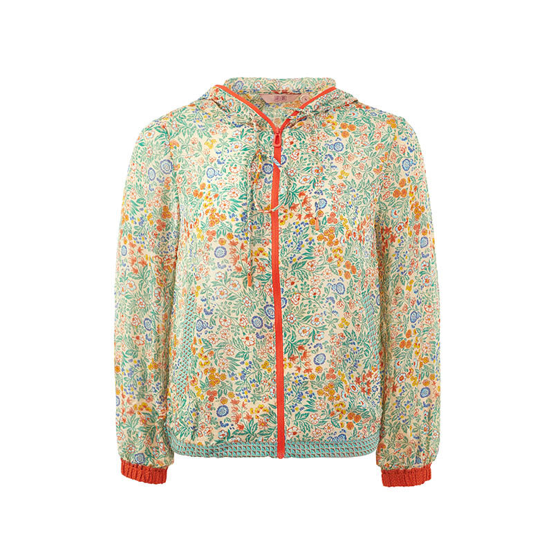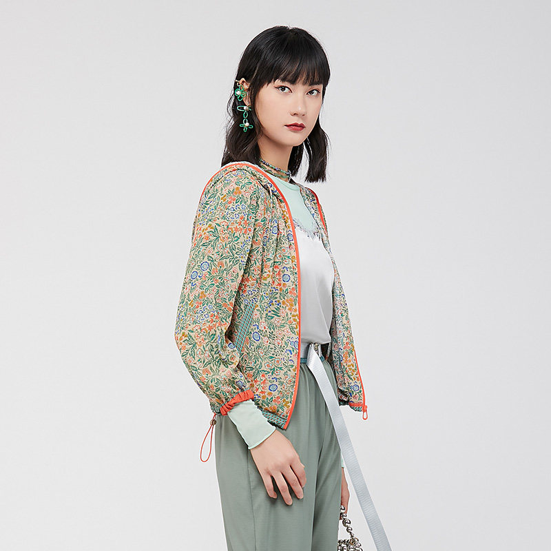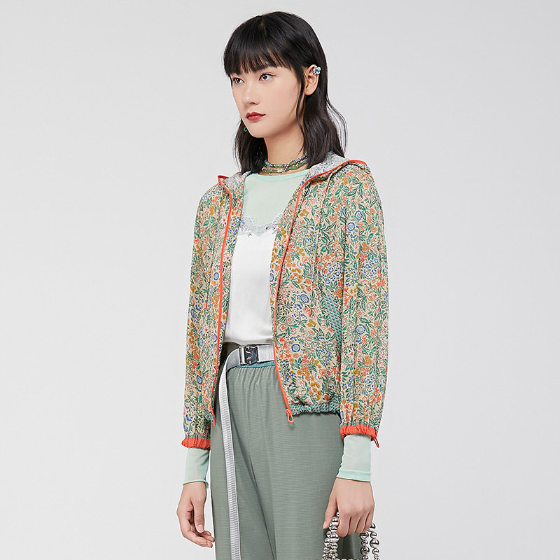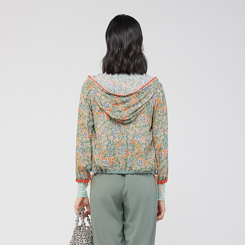 渔牌女装外套女款新款春夏薄款真丝连帽碎印花短外套FGGA3018