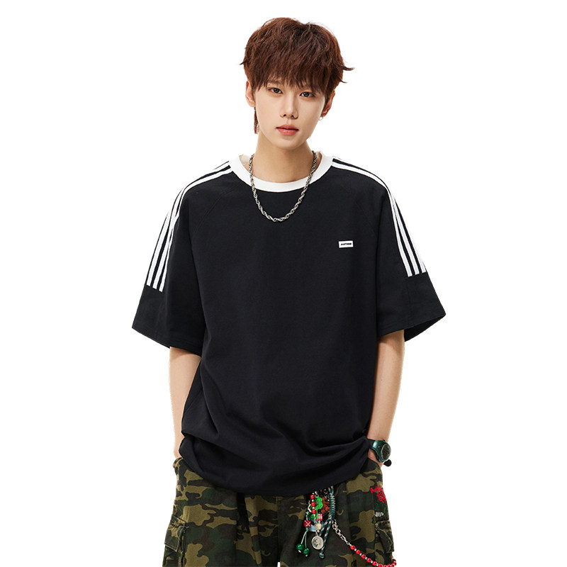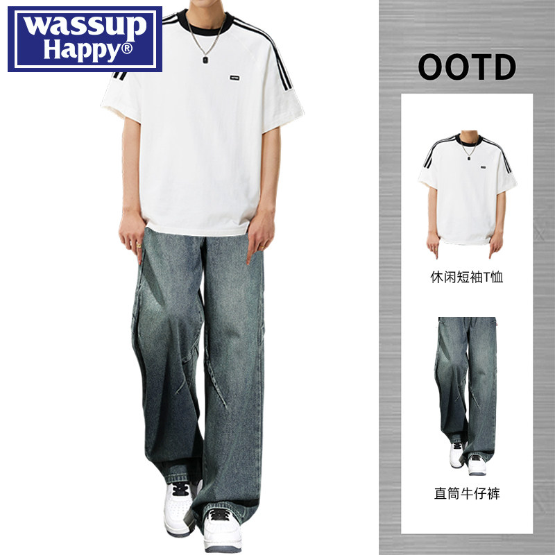 wassup happy重磅条纹插肩袖运动t恤男士夏季新款牛仔裤搭配套装