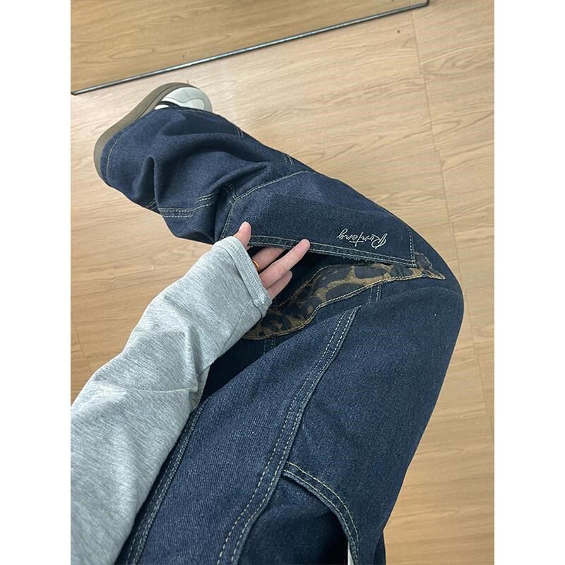特大码女装美式街头阔腿牛仔裤女胖mm豹纹设计感直筒长裤弯刀女裤