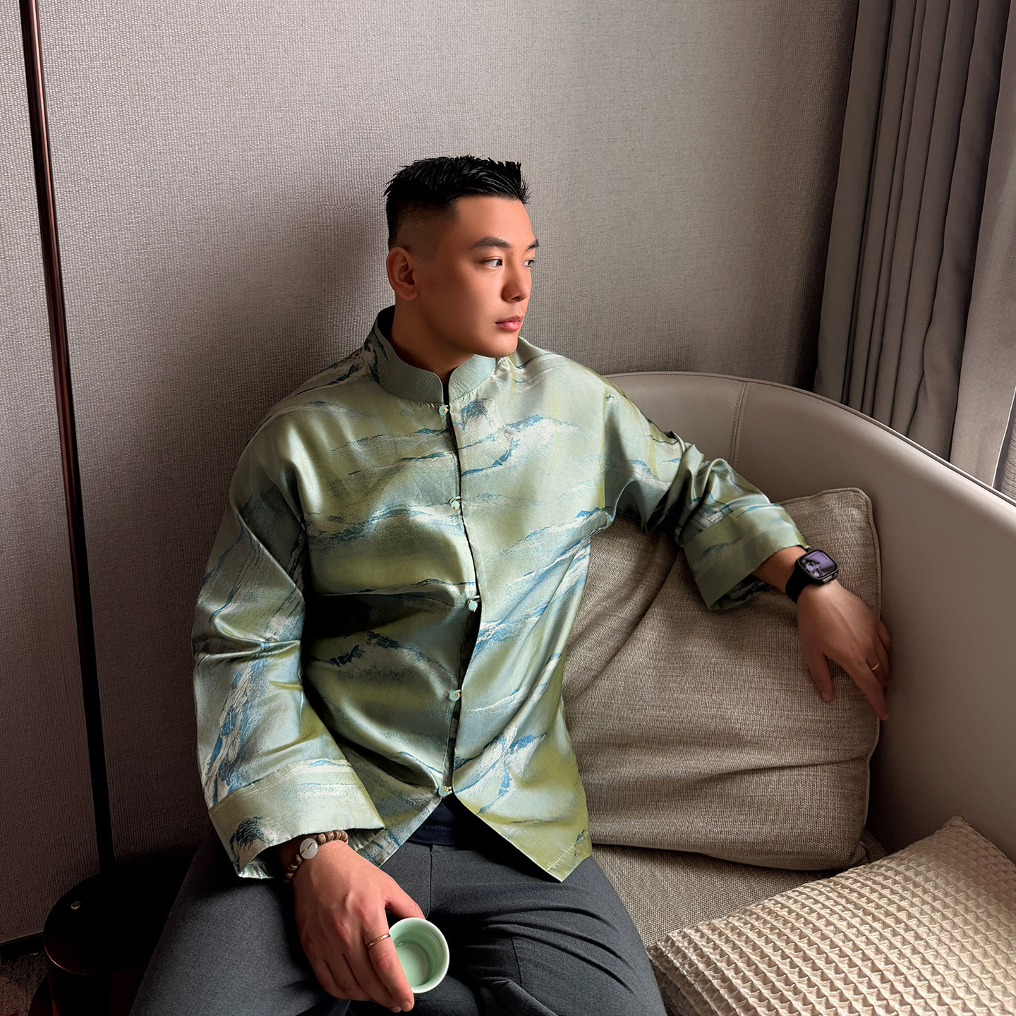 青山云三重门夏季唐装男款2026新款真丝欧根纱中国风外套国潮爸爸