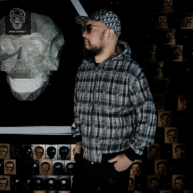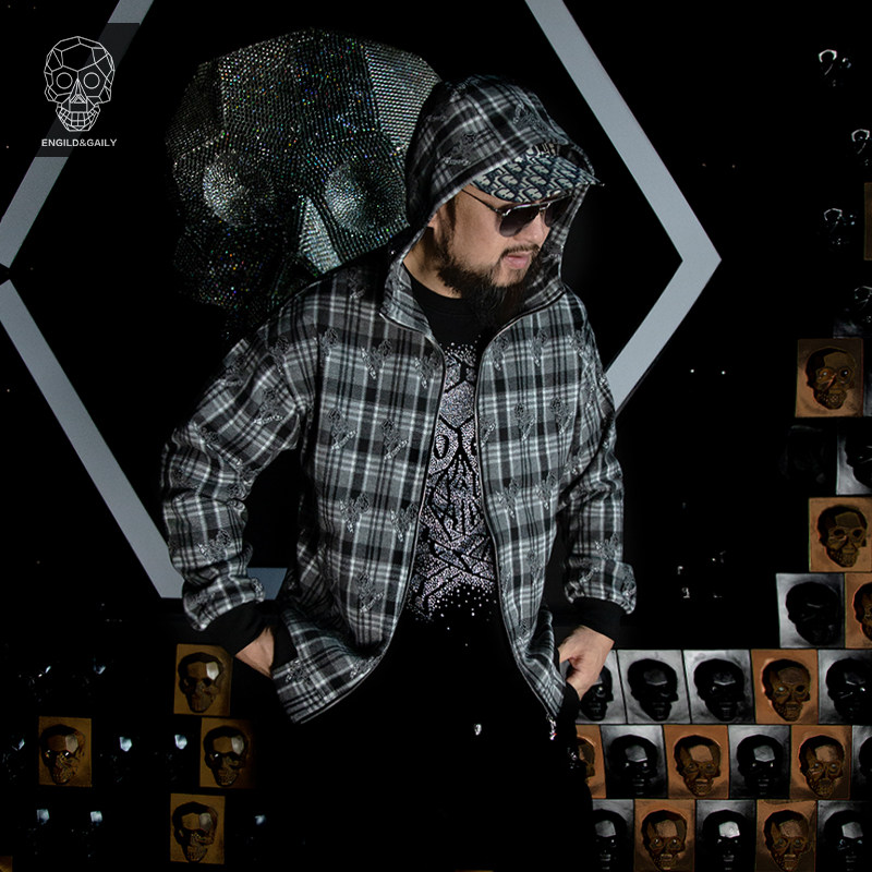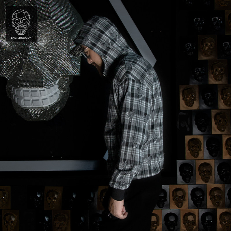 金刚铁甲骷髅头品牌原创设计美式潮牌复古连帽拉链外套格子夹克男