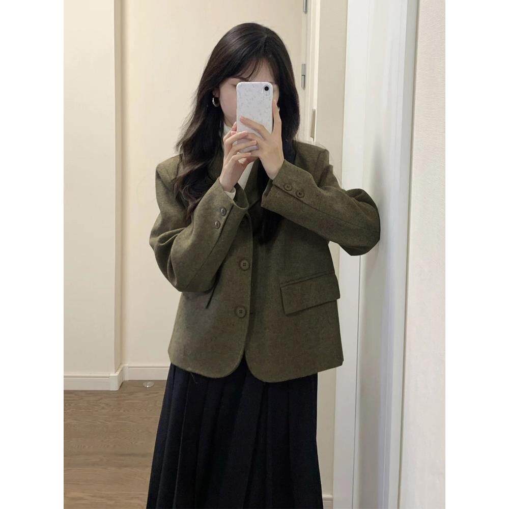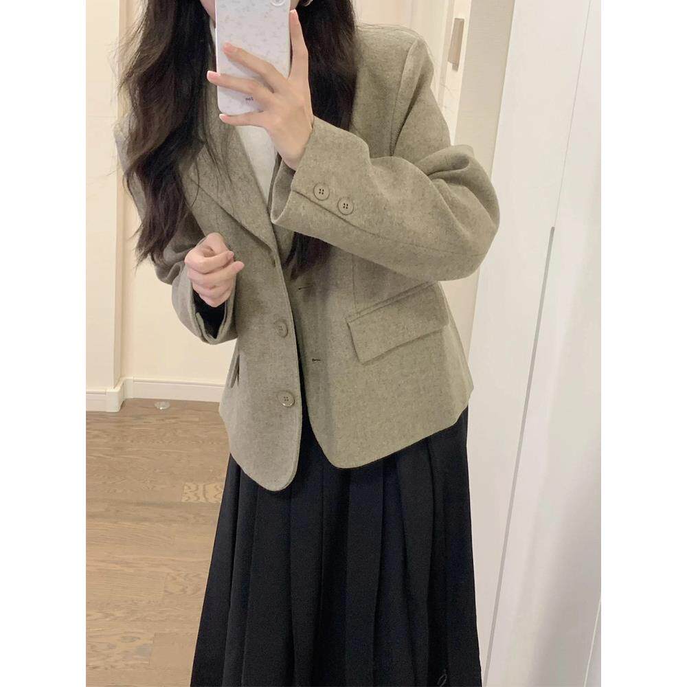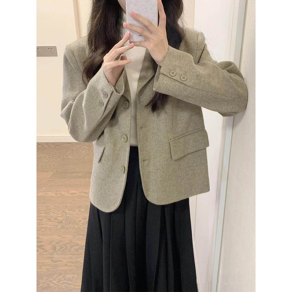 高级感灰绿色毛呢西装外套女春秋季新款小个子宽松休闲气质小西服