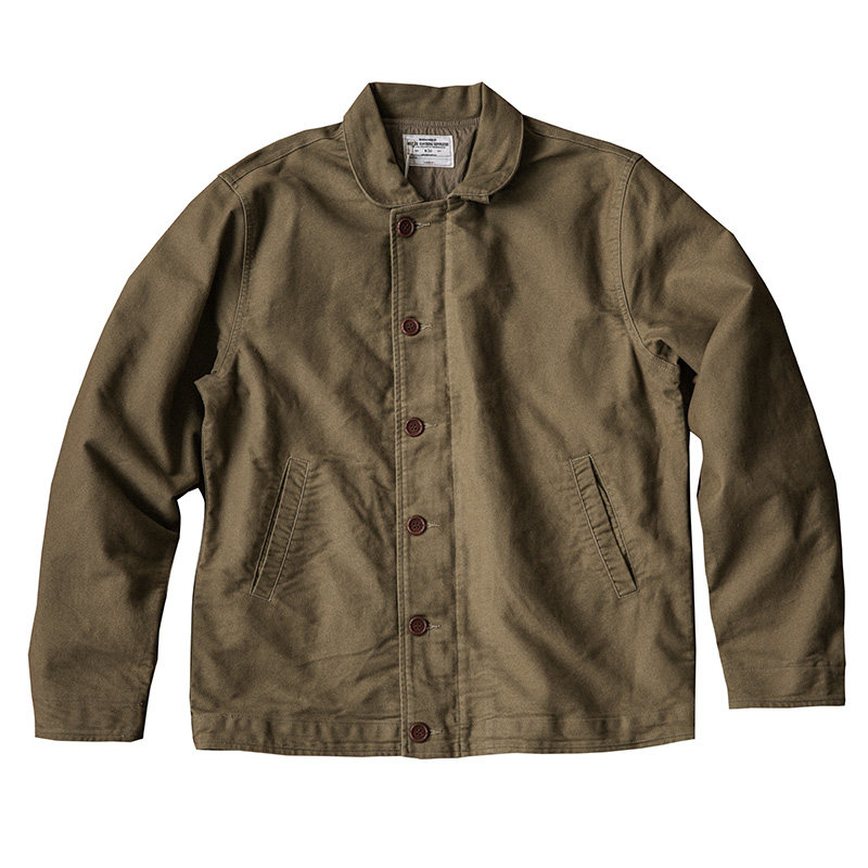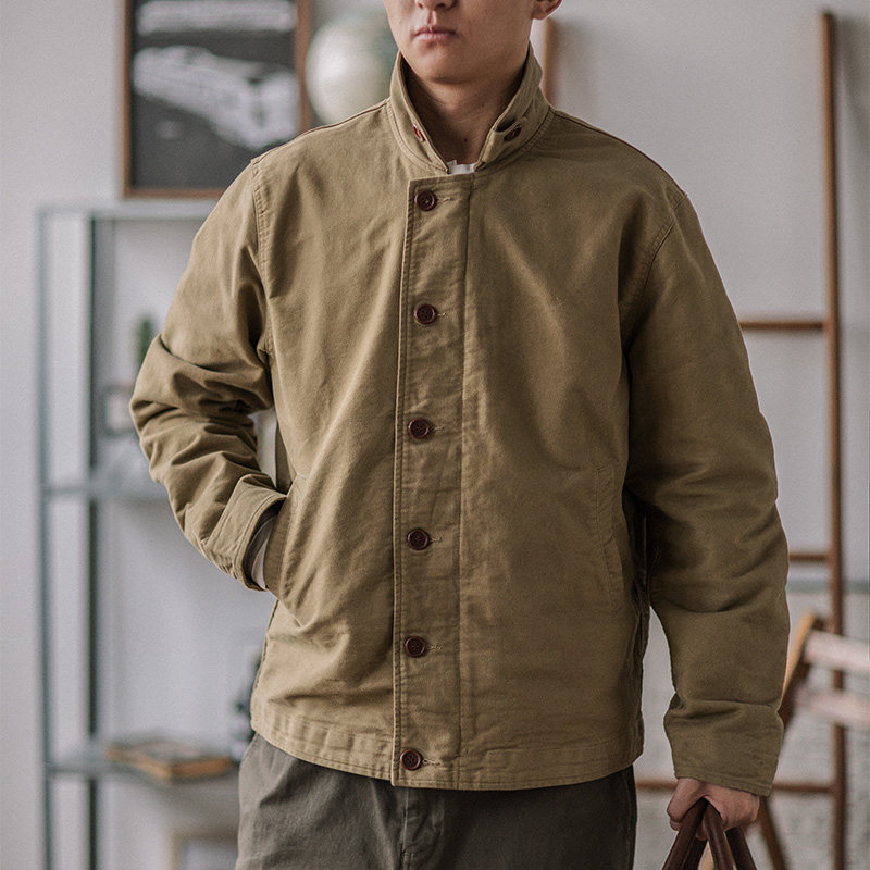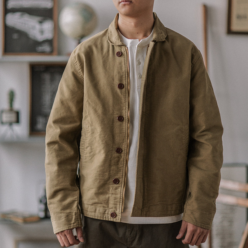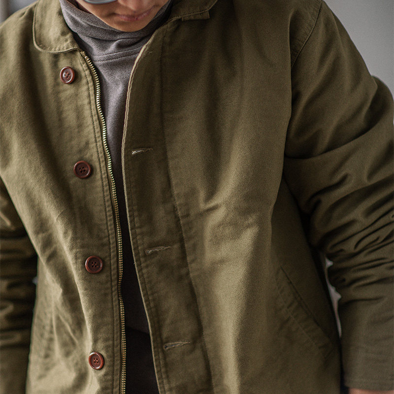 靛海阿美咔叽复古秋冬机车夹克鼹鼠皮质感英式苹果领重磅军绿外套