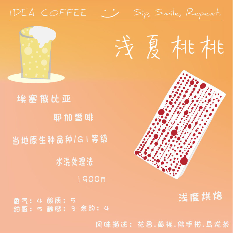 --------------------- IDEA 埃塞俄比亚浅夏桃桃 水洗耶加雪啡 精品手冲咖啡豆 新鲜烘焙 【原售价】42元 【现售价】42元 【推荐理由】
