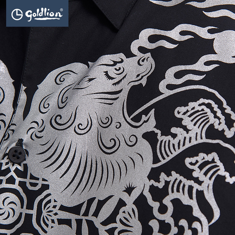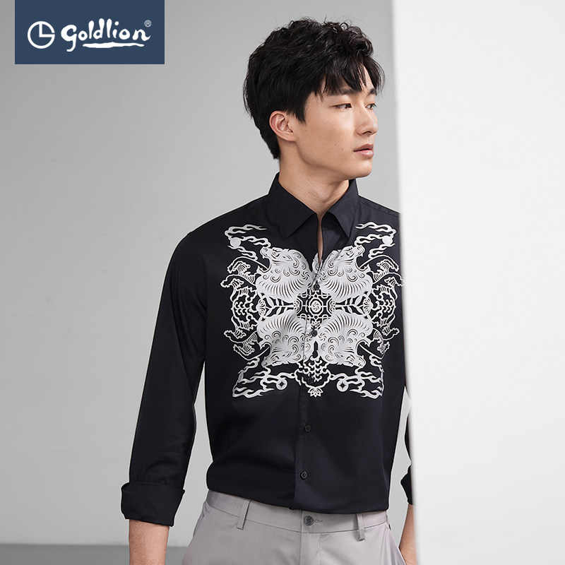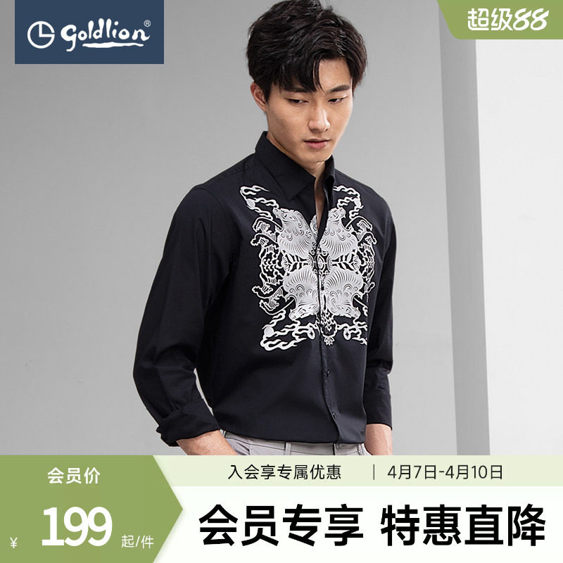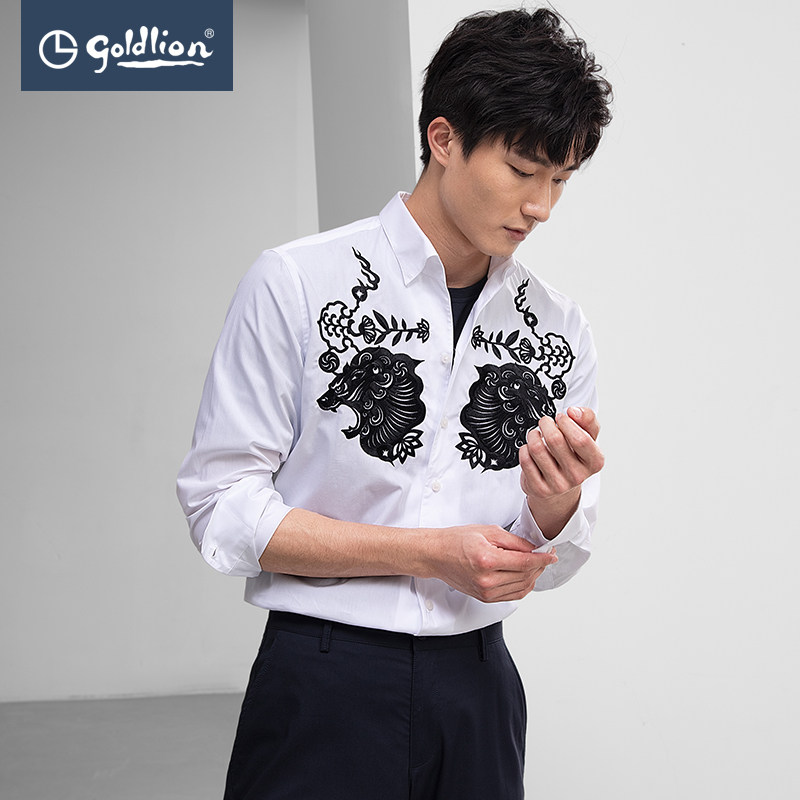 金利来奥特莱斯春夏款男士国潮纯棉狮子头刺绣暗扣领休闲长袖衬衫