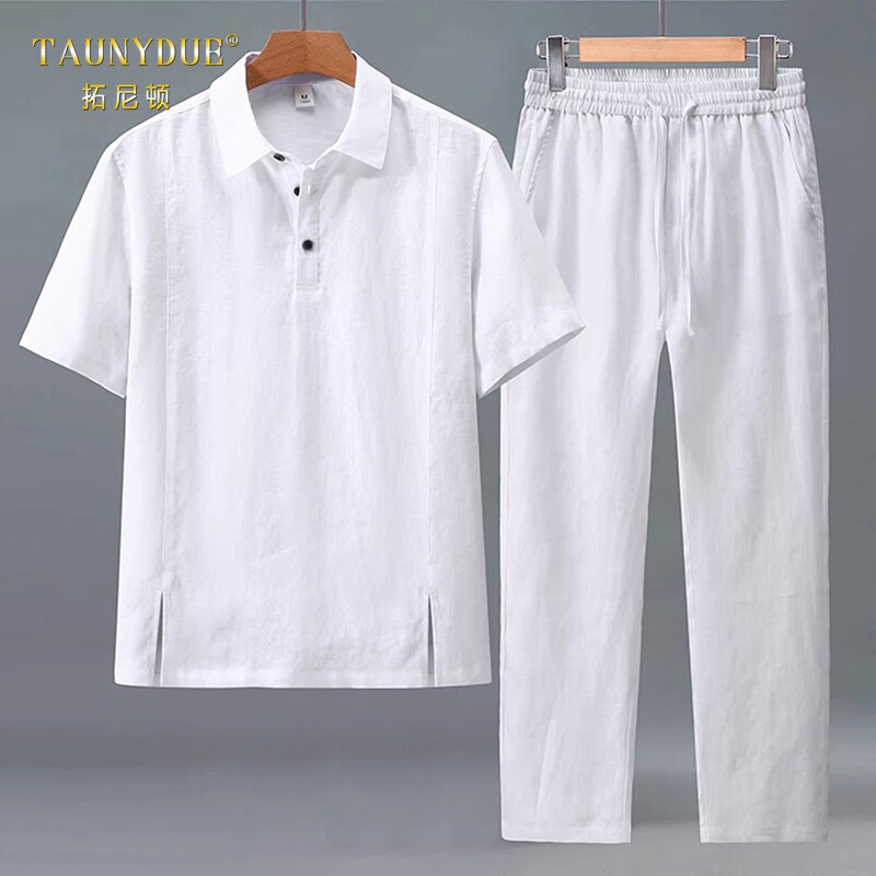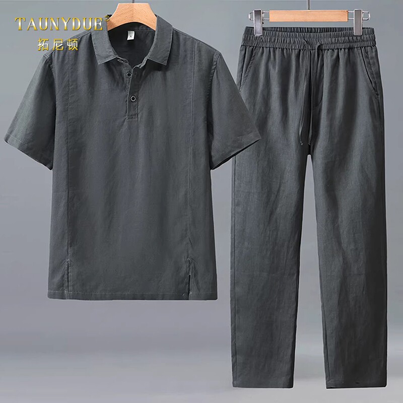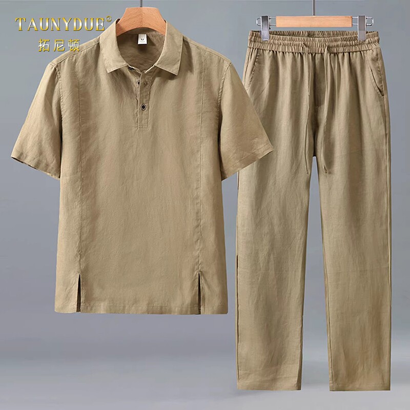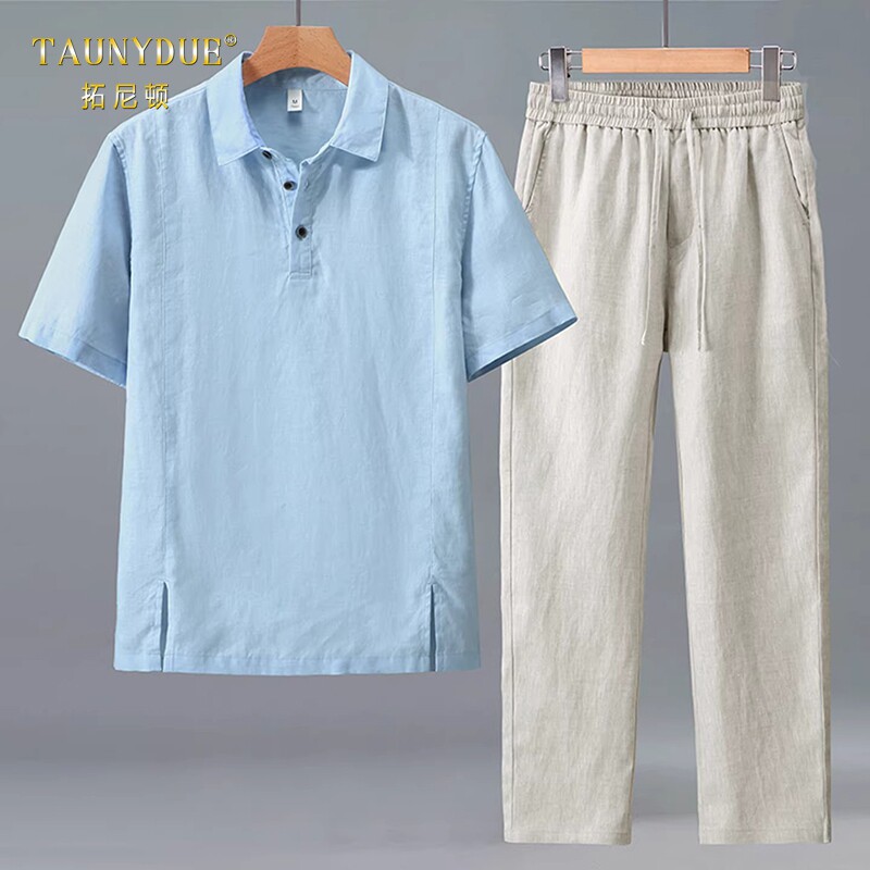 TAUNYDUE老钱风高端亚麻套装男夏季薄款短袖长裤中式休闲两件套