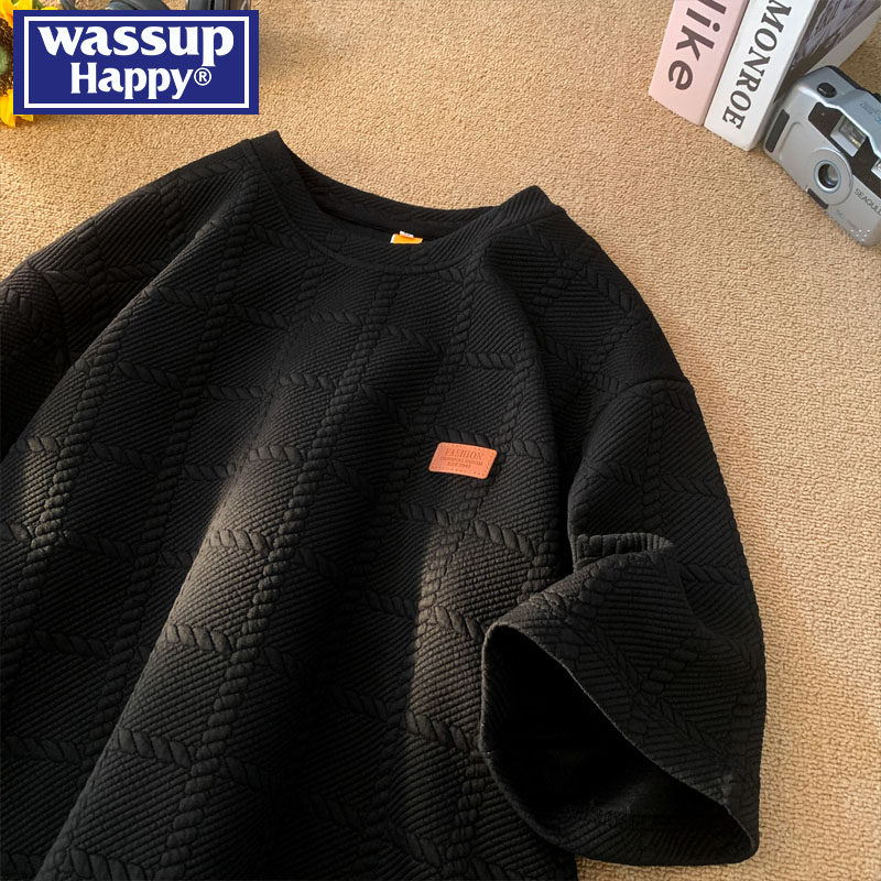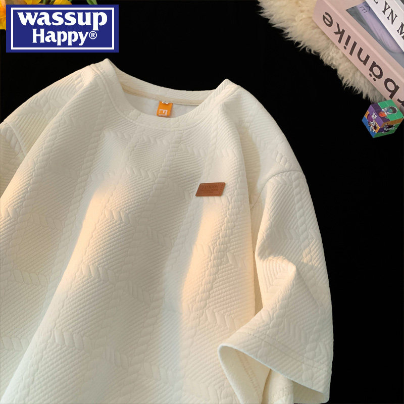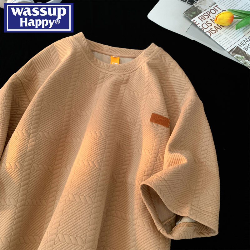 wassup happy美式纹理提花短袖男士夏季薄款宽松休闲圆领七分袖潮