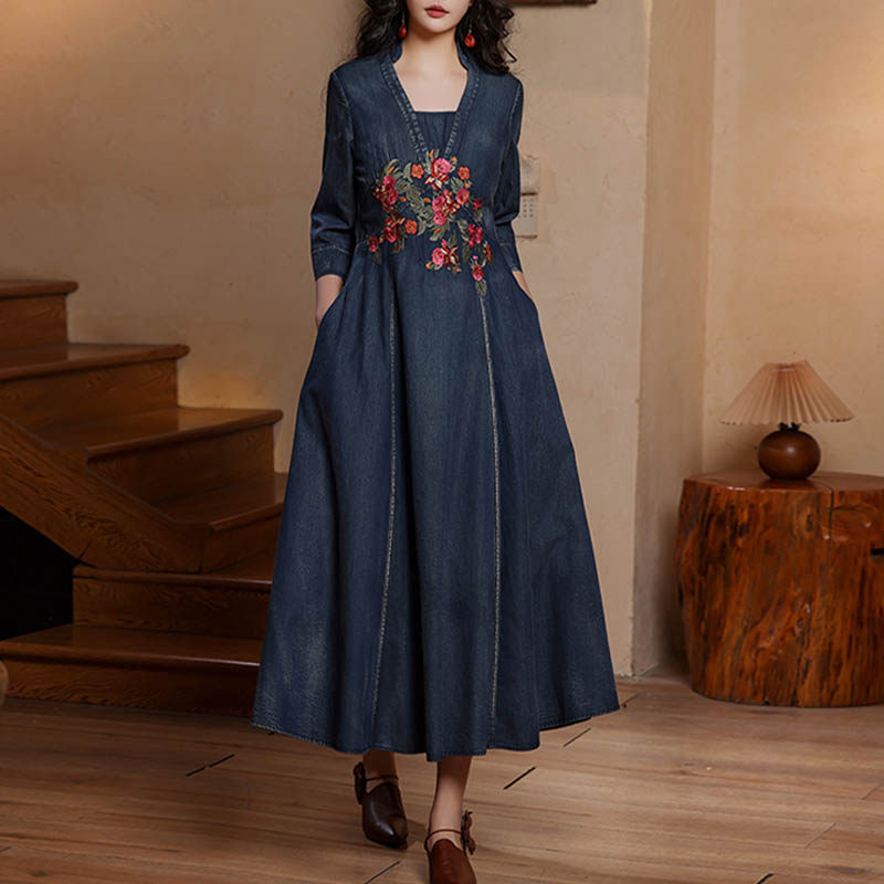 2026年新款春季民族风气质重工刺绣修身牛仔连衣裙女国潮复古裙子