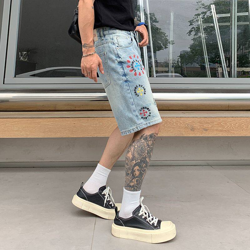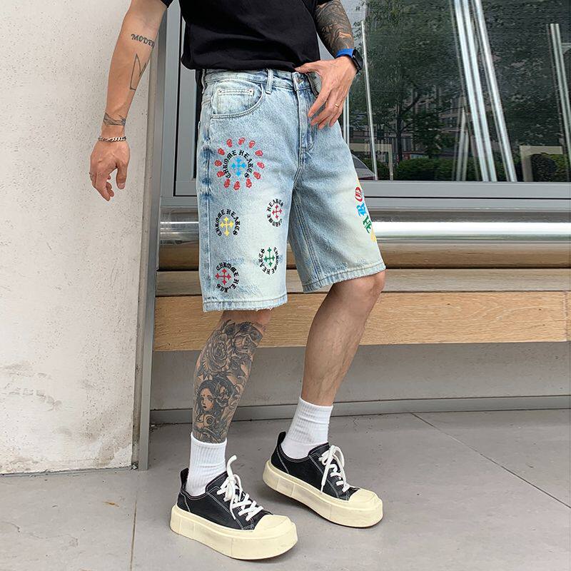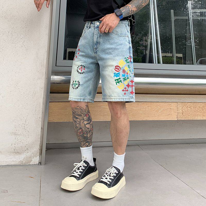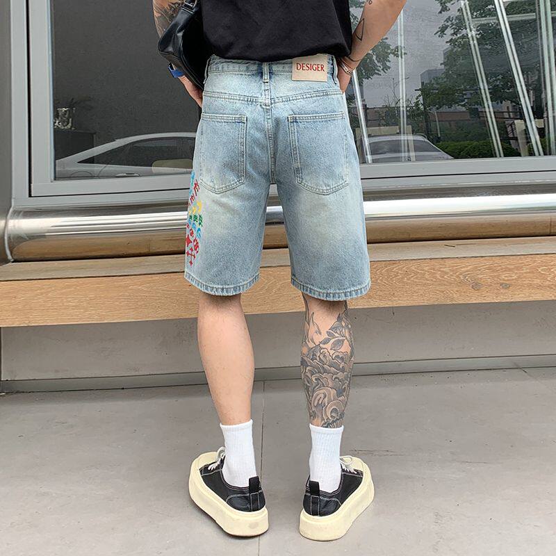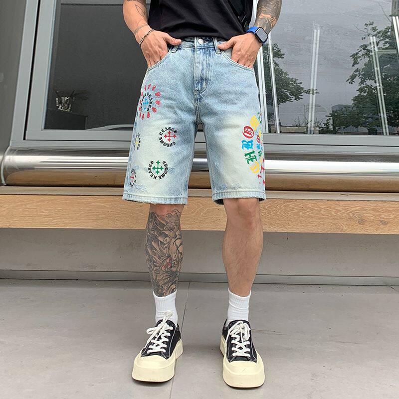 淘宝巴黎风潮牌美式复古高街手绘涂鸦直筒牛仔短裤男款设计感五分裤